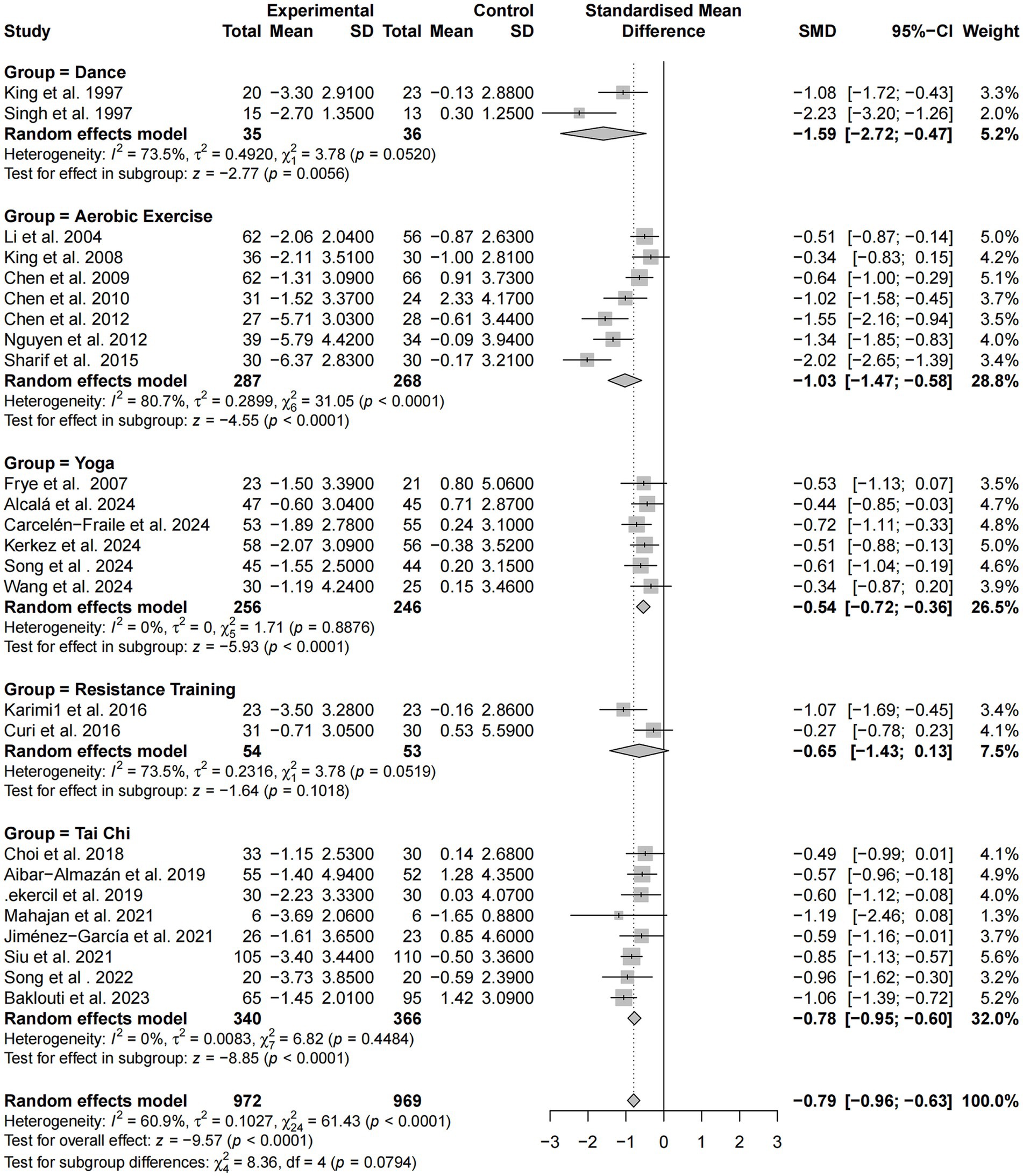 Among intervention types, dance-based programs showed the strongest effect (SMD = −1.59), albeit with substantial heterogeneity (I2 = 73.5%). Aerobic exercise also yielded a large effect (SMD = −1.03) with high heterogeneity (I2 = 80.7%). In contrast, yoga and tai chi interventions demonstrated stable and consistent effects, with effect sizes of −0.54 and −0.78, respectively, and no heterogeneity (I2 = 0.0%). Resistance training showed a modest effect (SMD = −0.65), but the confidence interval crossed zero, rendering the result statistically non-significant and heterogeneity relatively high (I2 = 73.5%).