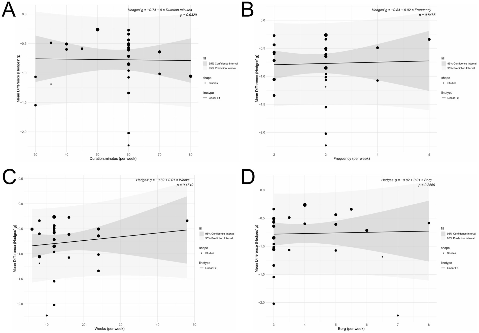 The meta-regression analysis revealed no statistically significant linear relationships between intervention effect and any of the following variables: session duration (p = 0.933), exercise intensity (p = 0.867), intervention frequency (p = 0.849), or total intervention duration (p = 0.452; Figure 11).