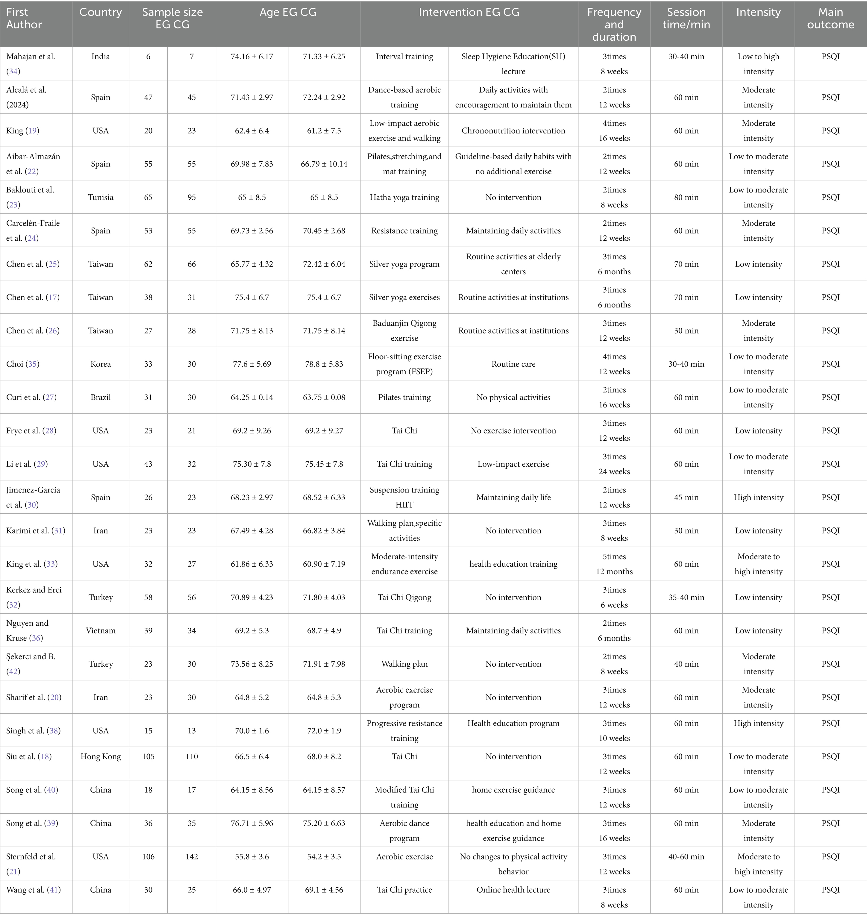 This meta-analysis included 26 studies (17–42) evaluating the effects of exercise interventions on subjective sleep quality in older adults.