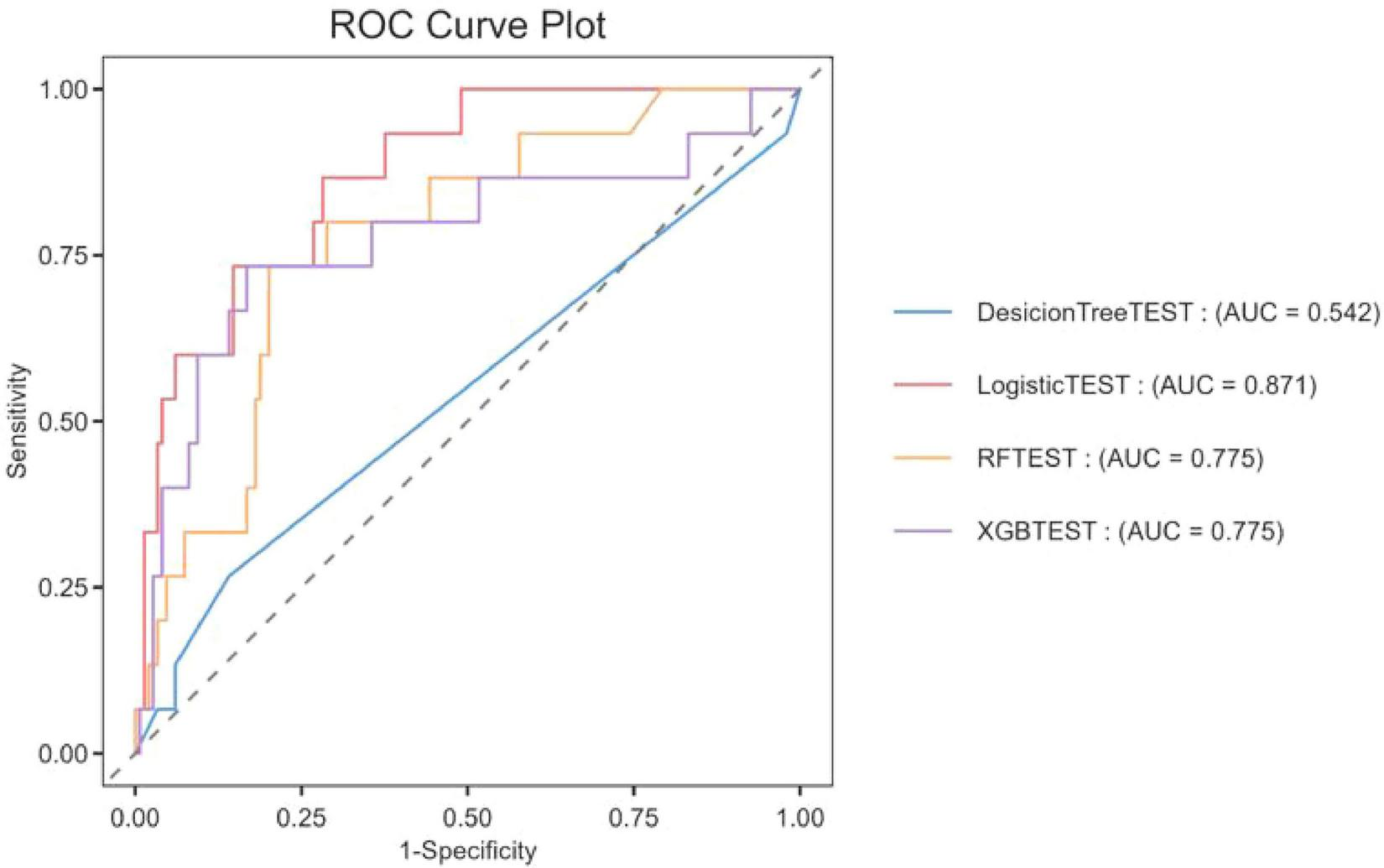 Four machine learning models -XGBoost, DecisionTree (DT), Logistic Regression (LR), and Random Forest (RF) -were used to construct the prediction model. The predictive performance of each model was evaluated by the area under the receiver operating characteristic curve. In addition, we calculated accuracy, precision, and F1 scores. In addition, in order to evaluate the practicality of the model in decision making by quantifying the net benefits under different threshold probabilities, decision curve analysis (DCA) was performed (18).