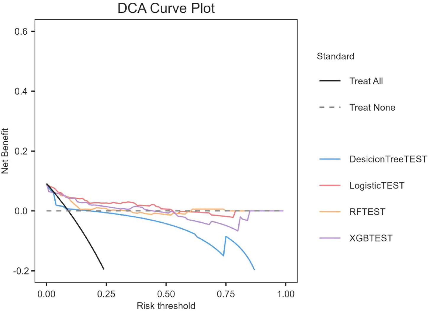The dataset was divided in a random fashion into two parts: 70% of the data was used to train the model, while 30% was used to validate the model. In the training dataset, we built four models: XGBoost, Logistic Regression (LR), Random Forest (RF), and Decision Tree (DT). The AUC values obtained from the test dataset are shown in Figure 2 and Table 2, respectively. Among these models, LR showed superior predictive performance with an AUC of 0.871, while DT had the lowest generalization ability with an AUC of 0.542. The net benefit of the best-performing model was compared with an alternative approach to clinical Decision making using Decision Curve Analysis (DCA) on the test dataset.