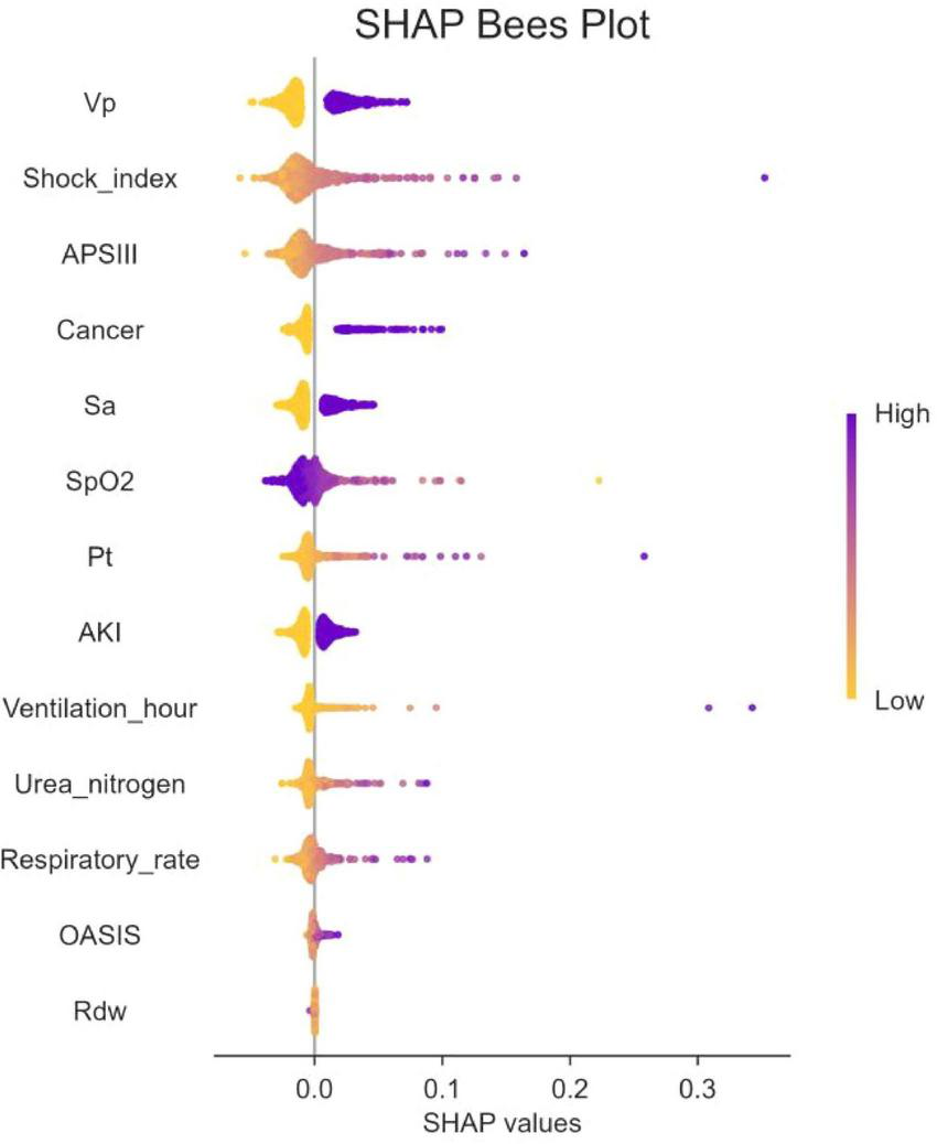Figure 6 shows the heat force plots for patients who did not survive and survived. The SHAP values provide insights into the predictive factors of individual patients and quantify the impact of each factor on mortality prediction. The numbers highlighted in bold represent the probabilistic predictions (f(x)), while the base values indicate the predictions made by the model without any input. The log odds ratio of each observation is represented by the function f(x). The left side displays red features that are associated with an elevated risk of mortality, while the blue features represent factors linked to a reduced risk of mortality. The magnitude of the effect on the prediction can be easily visualized by observing the length of the arrows.