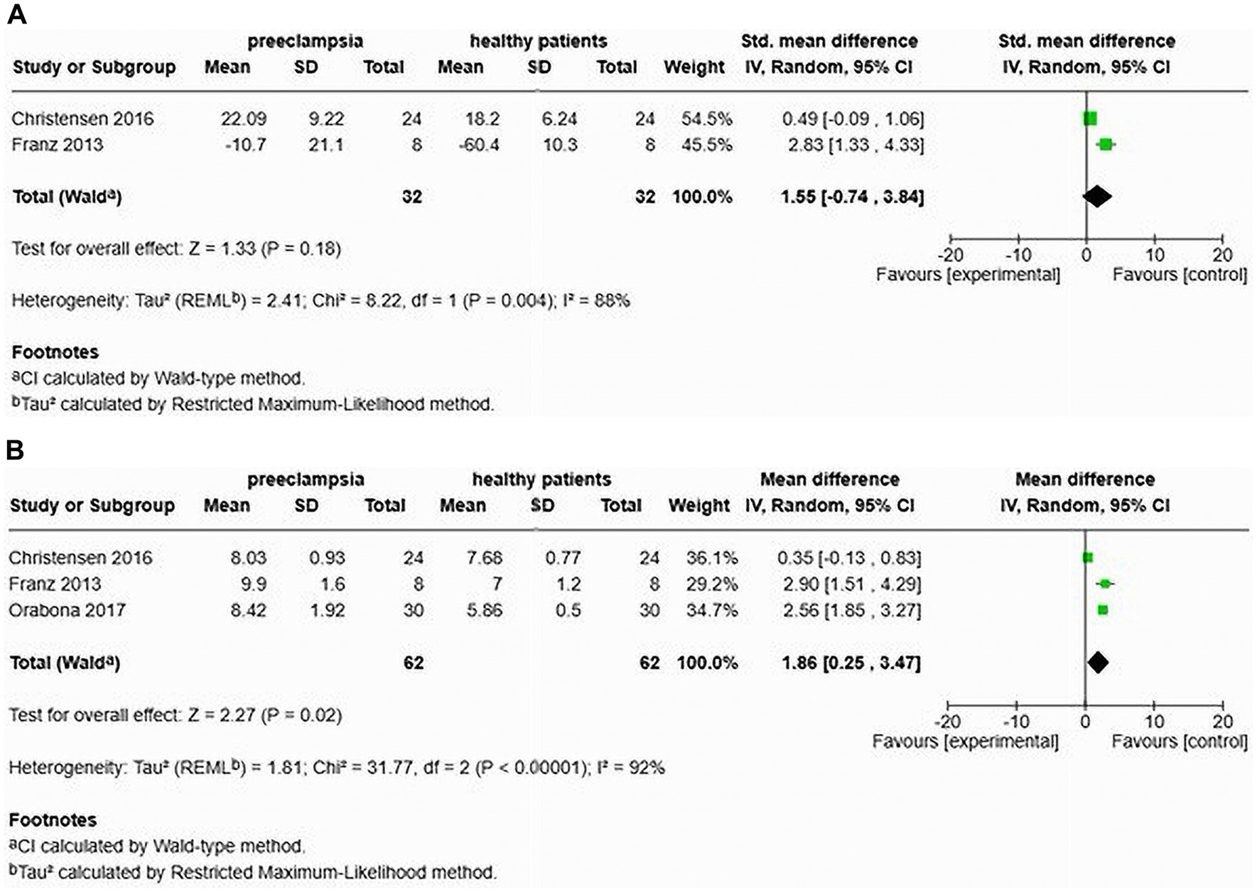 Figure 10. Pooled mean difference of the AIx (A) and PWV (B), of women with early onset preeclampsia compared to normotensive women.
