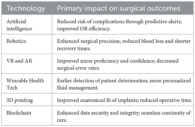 VR and AR are transforming nursing education and patient experience. These immersive technologies provide realistic, risk-free training simulations, allowing nurses to practice complex procedures and enhance their clinical reasoning (40, 41). For patients, VR can be used to reduce preoperative anxiety and manage postoperative pain (42, 43). AR provides real-time information overlays during procedures, aiding in anatomical visualization and procedural guidance (44). The primary impact is improved nursing proficiency and enhanced patient safety through better training and a reduction in surgical errors (45).