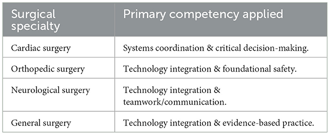 A defining competency of the contemporary intraoperative nurse is the ability to manage and integrate advanced technologies. This role has shifted from manual assistance to that of a technology manager, responsible for preparing robotic systems, handling patient-specific 3D-printed guides, and interpreting data from an array of digital sources (29–31). As the subsequent sections will detail, this technological proficiency is not a separate skill but is woven into all other competencies to enhance surgical precision, improve efficiency, and elevate patient safety.