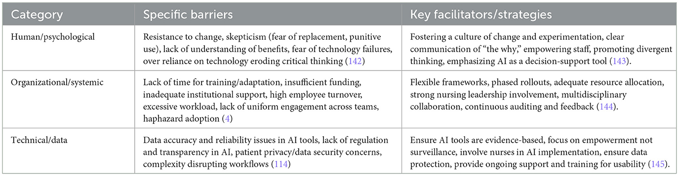 • Human factors: resistance to change is a significant barrier, often stemming from skepticism among nurses who fear job displacement or punitive use of data generated by new technologies (104, 105). Nurses, who rely heavily on intuition and clinical judgment, may be concerned that AI or other automated systems could diminish their professional autonomy and expertise (106). A lack of understanding of the benefits of new innovations and a fear of technology failures further contribute to this resistance (100, 107).