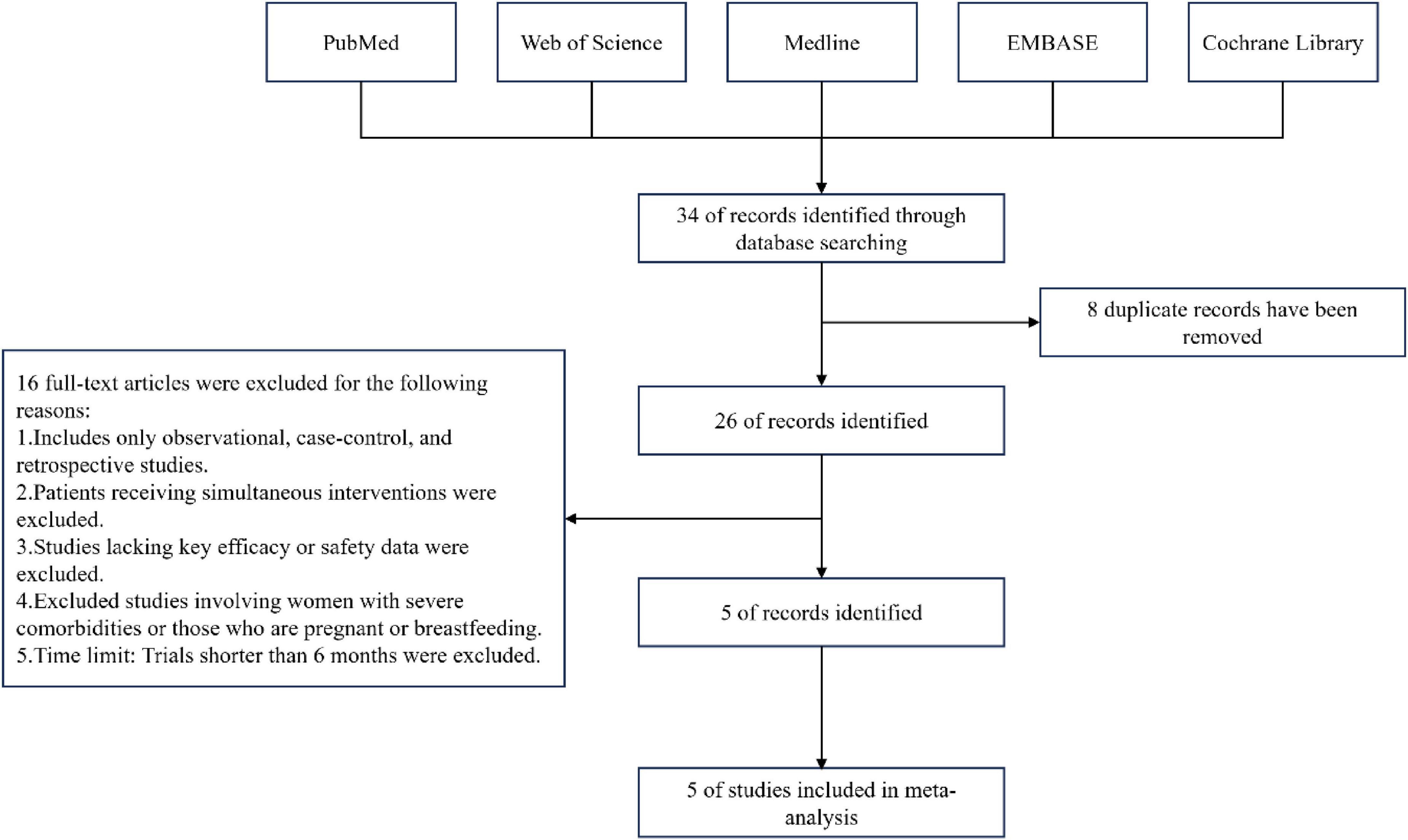 A total of 34 articles were retrieved from relevant databases, including 23 English-language publications and 11 articles in other languages. Based on the predefined inclusion and exclusion criteria, 5 studies were ultimately included, all of which were in English. The literature screening process is illustrated in Figure 1.