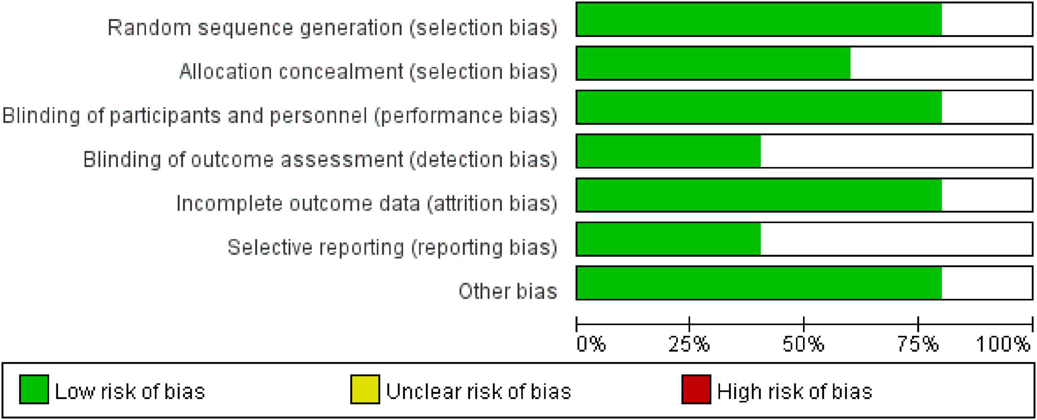 All 5 included studies were RCTs and were rated as having a “low risk” of bias. Furthermore, all studies were assessed as having a “low risk” of bias regarding the completeness of outcome data (Figure 2).