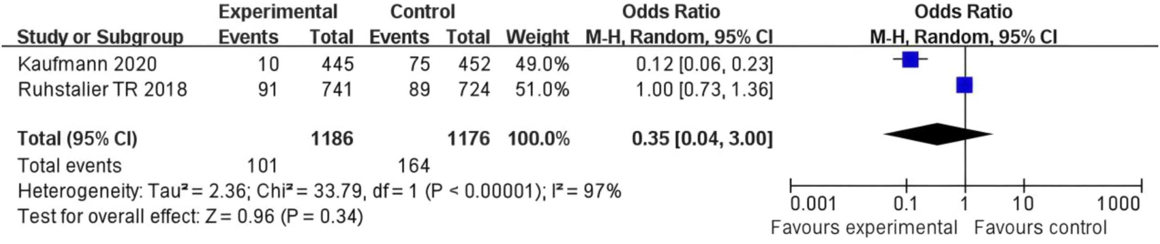 In Kaufmann 2020’s study, the experimental group had 81 events out of 746 participants, and the control group had 75 events out of 752 participants, with a weight of 49.9%. In Ruhstaller TR 2018s study, the experimental group exhibited 20 events from 441 participants compared to 69 events from 424 participants in the control group, contributing a weight of 50.1%. The OR across both studies was calculated to be 0.35 (95% CI: 0.04, 3.00), indicating no significant difference in outcomes between the experimental and control groups. The total number of events in the experimental group was 101, versus 144 in the control group. The heterogeneity test showed a Chi2 value of 21.01 (df = 1, P < 0.001), suggesting high variability between studies (I2 = 97%). The test for overall effect yielded a Z statistic of 0.99 (P = 0.34), reinforcing that there is no statistically significant difference between the groups (Figure 3).