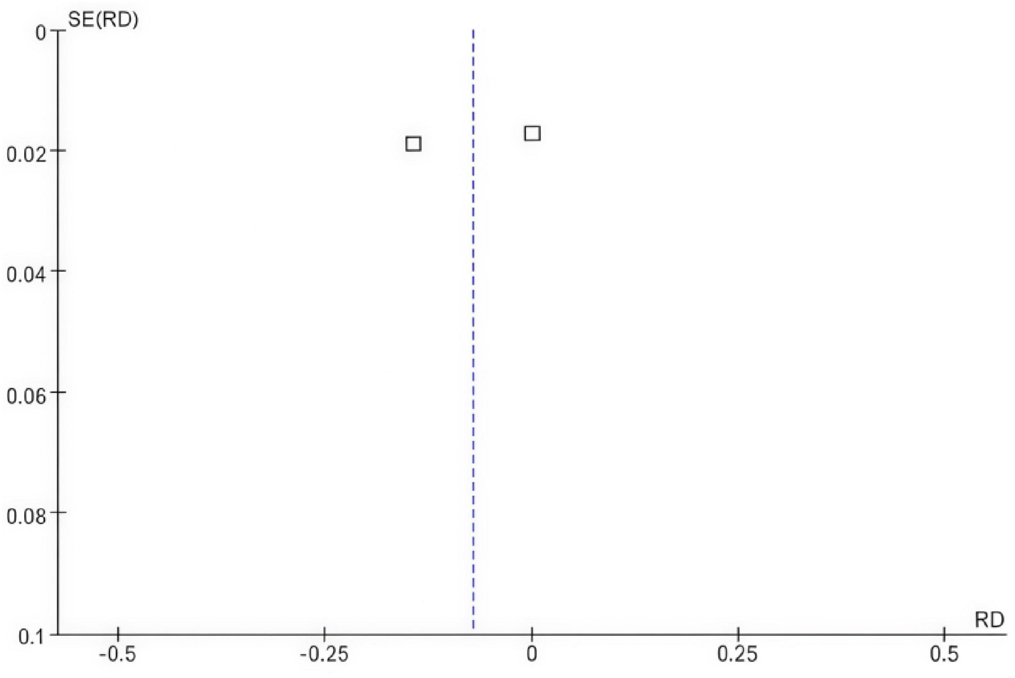 The funnel plot shows a symmetrical shape, suggesting that there is likely no substantial publication bias influencing the results, as the studies are evenly distributed on both sides of the mean risk difference of zero. Additionally, the vertical dashed line at zero represents the point of no effect, reinforcing that the risk differences observed in the studies are close to this value. Overall, the funnel plot indicates that the findings of the meta-analysis are robust and not significantly distorted by bias (Figure 4).