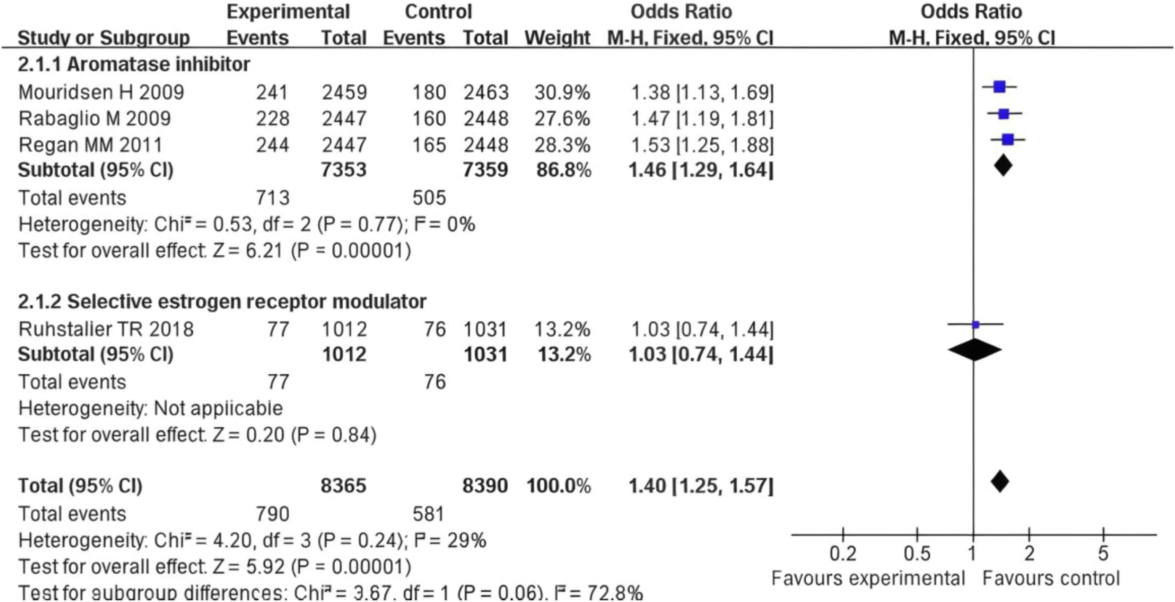 After pooling all subgroups, the overall OR = 1.40 with a 95% CI of (1.25, 1.57), (Z = 5.92), and (P < 0.001). This indicates that the overall risk of event occurrence in the experimental group (with two types of drugs combined) was significantly higher than that in the control group (Figure 7). The subgroup difference test showed Chi2 = 3.67, degrees of freedom (df) = 1, P = 0.06, and I2 = 72.8%. These results suggest a potential trend of difference between subgroups (a significant effect was observed in the aromatase inhibitor group, while no significant effect was found in the selective estrogen receptor modulator group). However, this difference did not meet the strict statistical criterion for “significant difference.”