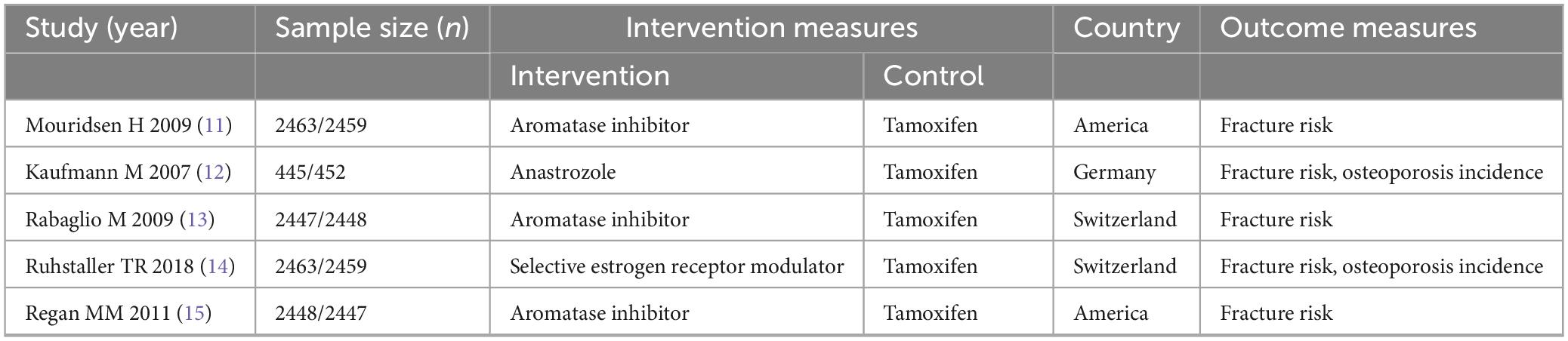 Although numerous studies have investigated the impact of various endocrine therapies on BMD and fracture risk in postmenopausal breast cancer patients, their findings remain inconsistent, and a systematic comprehensive analysis is lacking (9, 10). Therefore, this study aims to conduct a systematic review and meta-analysis to synthesize existing evidence and compare the effects of different endocrine therapies on BMD and fracture risk in postmenopausal breast cancer patients. The findings may provide clinicians with evidence-based insights for selecting optimal endocrine regimens, enabling a better balance between therapeutic benefits and skeletal health risks, ultimately improving patients’ quality of life.