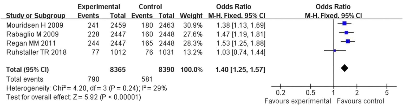 ![Forest plot showing odds ratios for four studies comparing experimental and control groups. Each study lists events, totals, weight, and odds ratios with 95% confidence intervals. Overall effect shows an odds ratio of 1.40 [1.25, 1.57]. Tests indicate low heterogeneity (Chi² = 4.20, P = 0.24) and significant overall effect (Z = 5.92, P < 0.00001). Squares represent study-specific effect sizes; the diamond represents the overall effect.](https://www.frontiersin.org/files/Articles/1665389/xml-images/fmed-12-1665389-g005.webp)