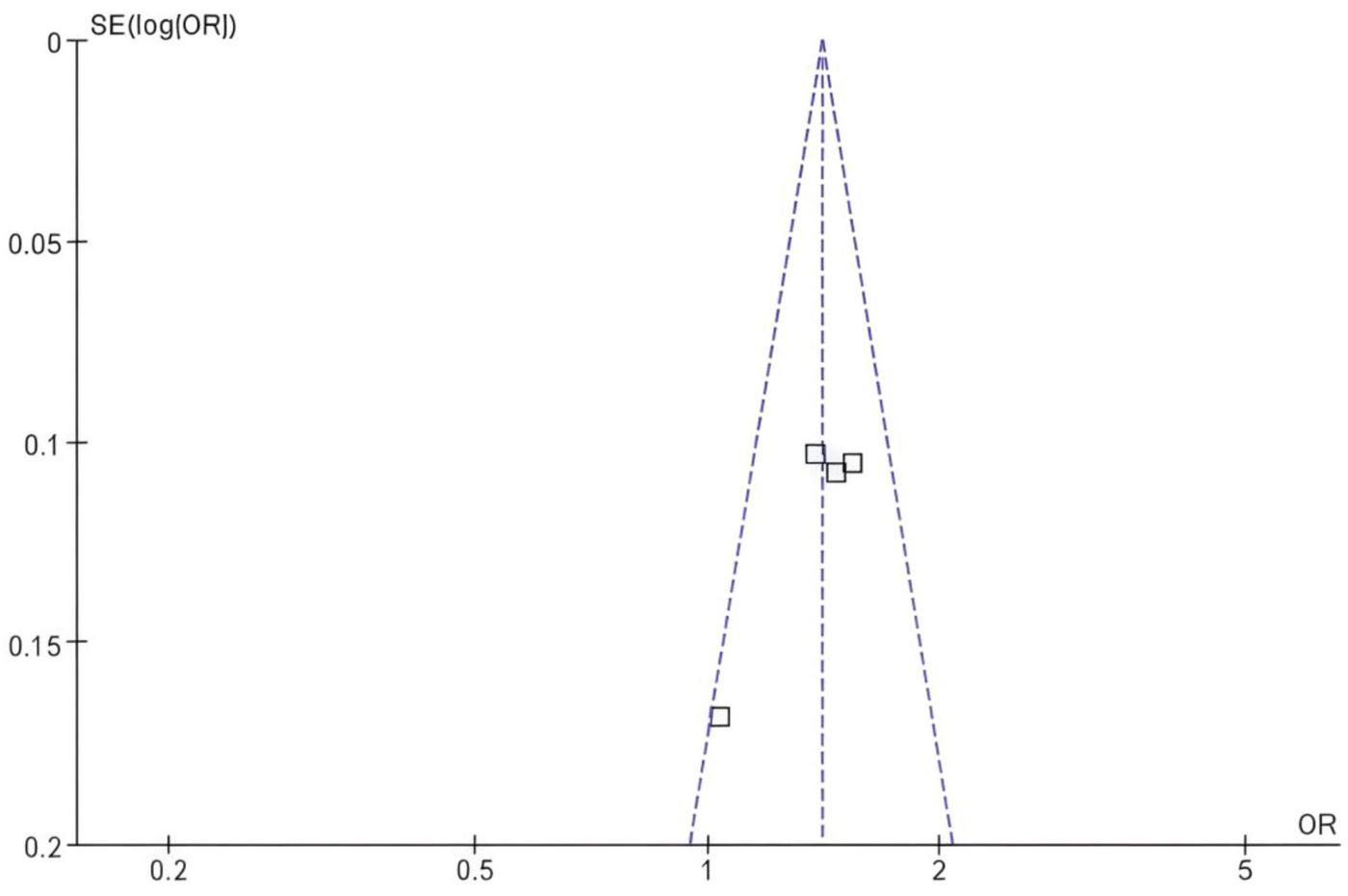 ![Funnel plot displaying the standard error of the log odds ratio (SE(log[OR])) on the y-axis and the odds ratio (OR) on the x-axis. The plot features several data points, represented by squares, scattered along the funnel-shaped area created by dashed lines, indicating possible publication bias.](https://www.frontiersin.org/files/Articles/1665389/xml-images/fmed-12-1665389-g006.webp)