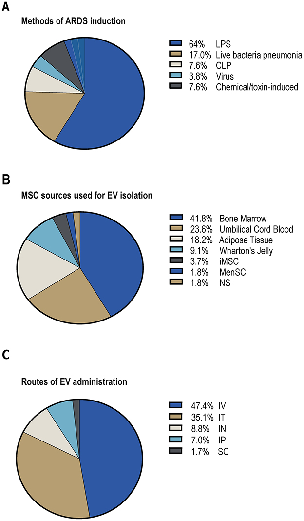 Figure 2. MSC-EVs for the treatment of in vivo ARDS. (A) Methods of ARDS induction. (B) MSC sources used for EV isolation. (C) Routes of EV administration. LPS, lipopolysaccharide; CLP, cecal ligation and puncture; iMSC, induced pluripotent stem cell-derived MSCs; MenSC, menstrual blood-derived MSCs; NS, not specified; IV, intravenous; IT, intratracheal; IN, inhalation; IP, intraperitoneal; SC, subcutaneous.