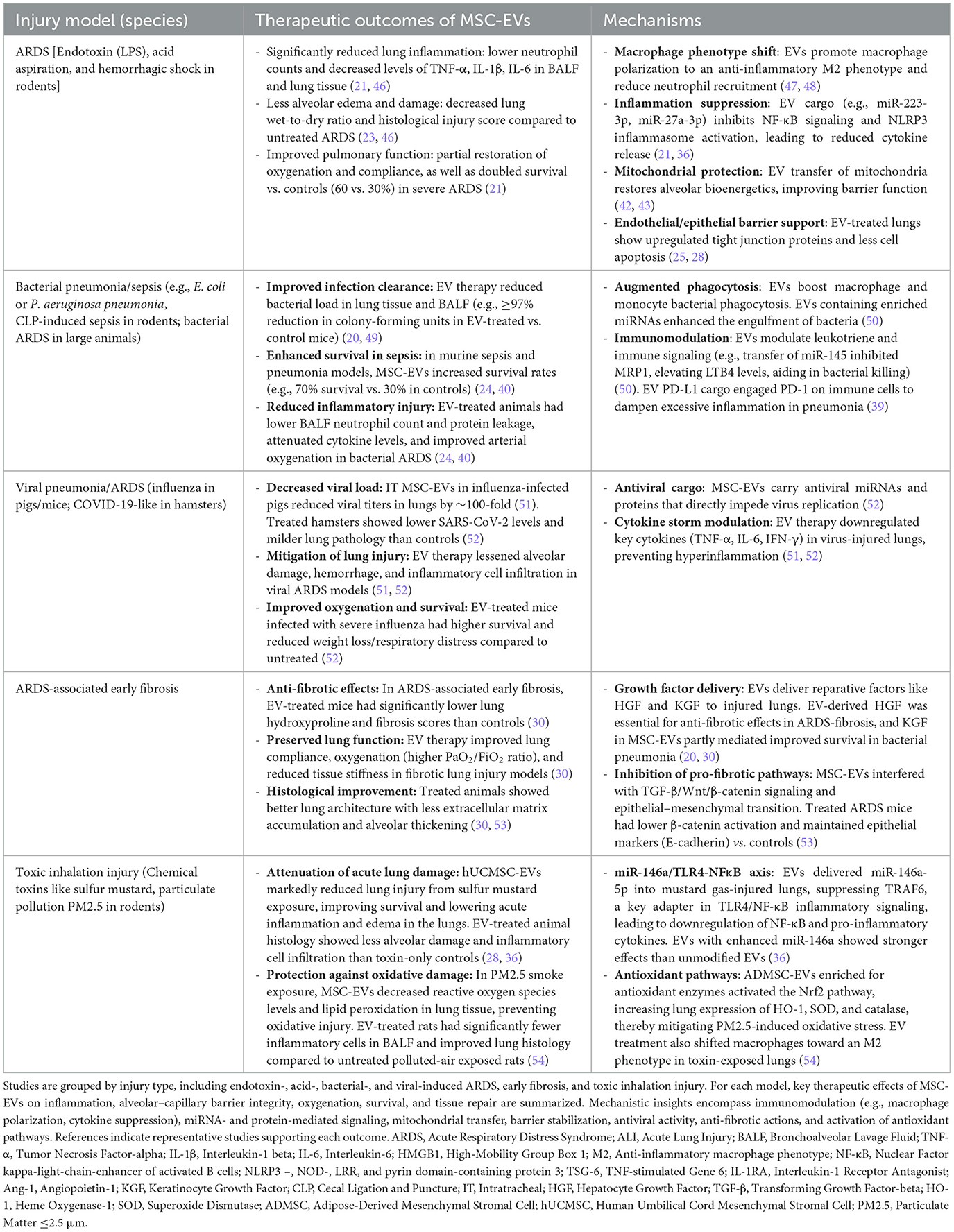 Despite the heterogeneity of ARDS models, the anti-inflammatory effects of MSC-EVs were consistently observed. This was accompanied by enhanced expression of IL-10, Vascular Endothelial Growth Factor (VEGF), and antioxidant enzymes [e.g., Superoxide Dismutase (SOD), catalase], with downstream improvements in oxygenation (PaO2/FiO2), lung histology, and survival (25, 29, 30).