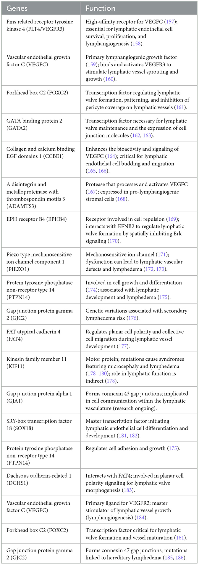 Canonical clinical entities include Milroy disease, caused by mutations in FLT4/VEGFR3, and lymphedema–distichiasis syndrome, associated with FOXC2 mutations. Emberger syndrome, caused by GATA2 haploinsufficiency, links primary lymphedema with hematological malignancies (6, 7). More recently, novel variants in PROX1 and HGF have been reported, expanding the genetic landscape (8, 9).