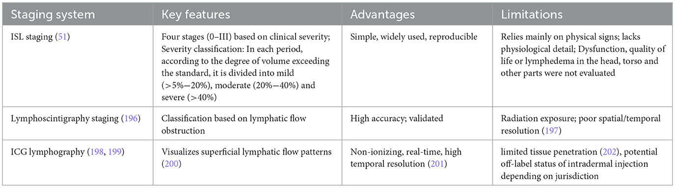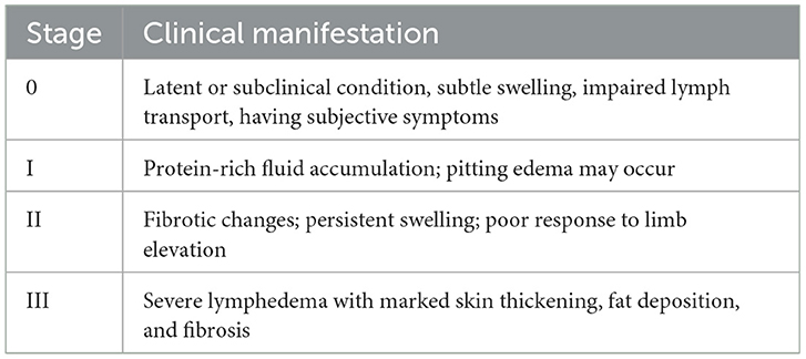 An ideal staging system should be comprehensive, reproducible, and correlate with imaging and clinical manifestations. While there exist many staging methods in use, the most often utilized one is recommended by the International Society of Lymphedema (ISL), which classifies lymphedema into four levels of severity, namely stage 0 to stage III. The corresponding clinical manifestations and sorting criteria are shown in Table 3, which has been adapted from ISL (2023) (51).