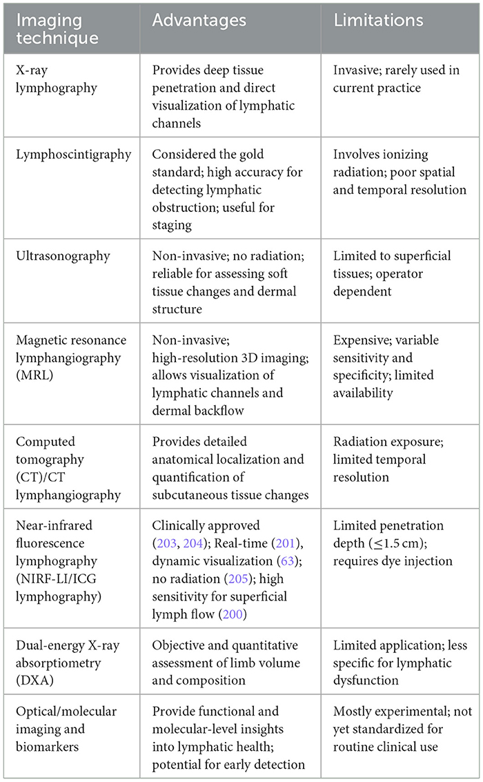 Different approaches possess unique qualities. ICG lymphography is limited to visualizing superficial lymphatic flows up to a depth of 1.5 cm. In contrast, lymphoscintigraphy and magnetic resonance lymphography are better suited for evaluating deep lymphatic flows (65). However, Lymphoscintigraphy exposes patients to ionizing radiation and has poor spatial and temporal resolution. Each examination has merits and demerits, and we should combine several examinations to evaluate the lymphatic conditions accurately (67, 87). For instance, MRL can serve as a complementary method to be used alongside ICG-L in preoperative evaluations for LVA. This is because it is less effective at identifying lymphatic vessels in the initial stages of lymphedema when lymph stasis or lymphangiectasia are not present (88). Ultrasonography provides a noninvasive and non-ionizing diagnostic technique for patients with lymphedema by assessing the shear wave speed of subcutaneous tissue and visible dermal structure (89, 90). Other objective evaluations of lower extremity lymphedema including dual-energy X-ray absorptiometry (DXA) (91), and imaging biomarkers (92), serve the diagnostic procedure of lymphedema in different ways. The advantages and limitations of some of the technologies are summarized in Table 5.