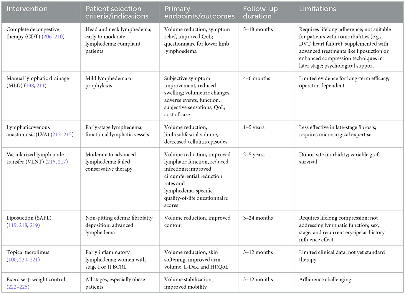 The immune functions exhibit a notable decrease in individuals with secondary lymphedema, accompanied by an upregulation of many T-cell-associated networks in such circumstances. Furthermore, it has been demonstrated that lymphatic dysfunction plays a role in promoting secondary bacterial and fungal infections, as well as initiating inflammation in the skin and subcutaneous tissue, contributing to the advancement of lymphedema. Therefore, CD8+T-cell exhaustion patterns should be taken into consideration for the prevention of lymphedema (155). The study found that CD4+T cells contribute to lymphangiogenesis are activated in regional lymph nodes and migrate to the skin to initiate lymphedema which demonstrates that the CD4+T cell is a potential therapeutic target for the prevention of lymphedema (112, 116, 156). As shown in Table 6, the clinical evidence for the main treatment methods in lymphedema management is summarized.