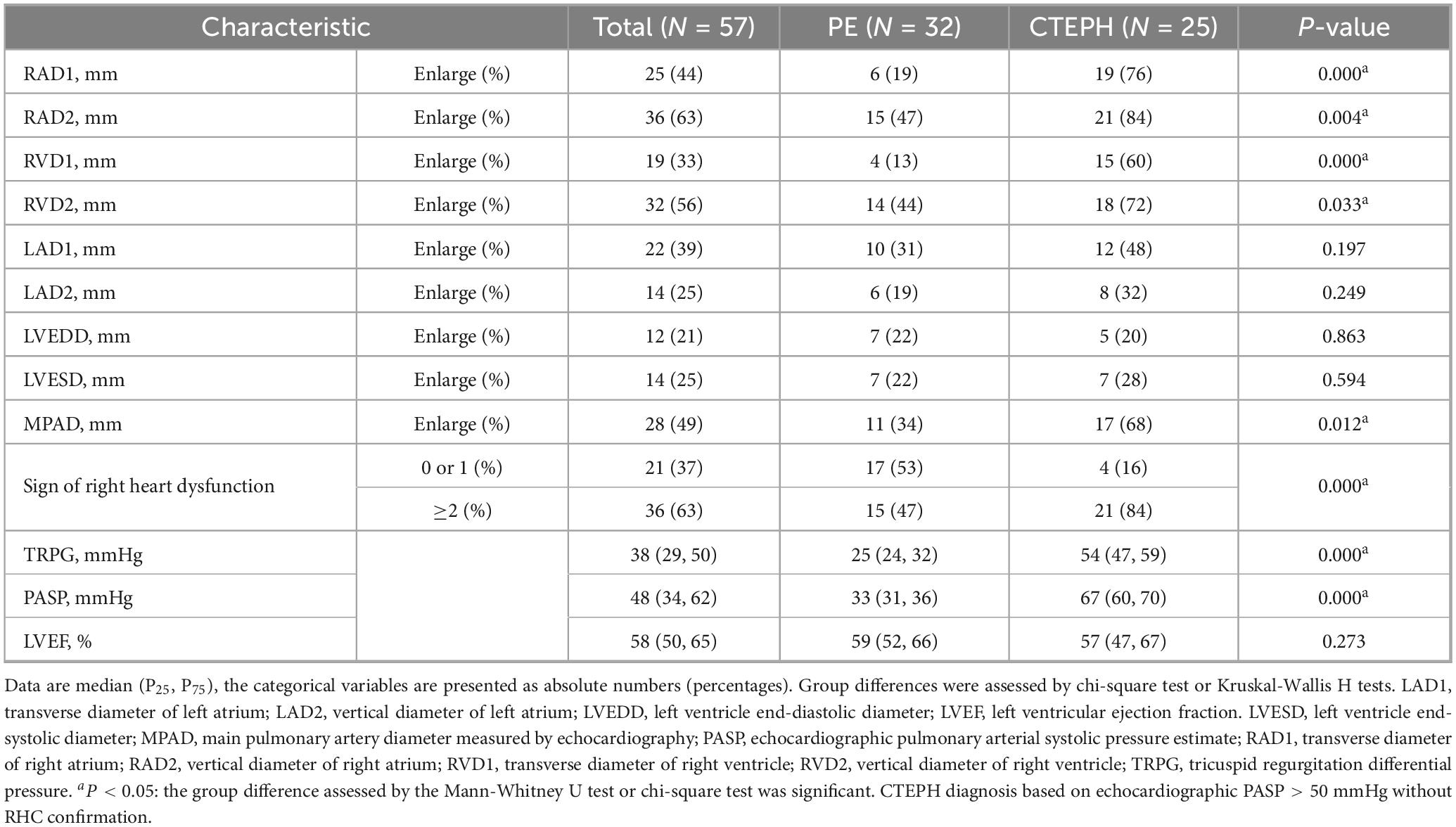 Notably, previous studies have indicated elevated levels of D-dimer, BNP, and CRP in patients with CTEPH compared to PE patients in low-altitude area (40, 41). However, this differed from the conclusions of the present study, which might potentially be attributed to delayed medical consultation caused by limited healthcare resources in high-altitude regions, or the hypoxic environment at high altitude predisposing individuals to thromboembolic events, contributing to the development of high-altitude heart disease (38, 39). Right ventricular dysfunction, adverse remodeling, and associated hemodynamic abnormalities are key predictors of disease progression and mortality in CTEPH patients (42). Besides, our findings demonstrate that CTEPH is associated with more pronounced right heart dysfunction than simple PE, emphasizing that progressive right atrium and right ventricle dilation in CTEPH is a key pathophysiological feature underlying its clinical severity, as evidenced by right heart enlargement and hemodynamic alterations. Additionally, the results provide stronger clinical insights into the impact of CTEPH on cardiac structure and function at high-altitude.