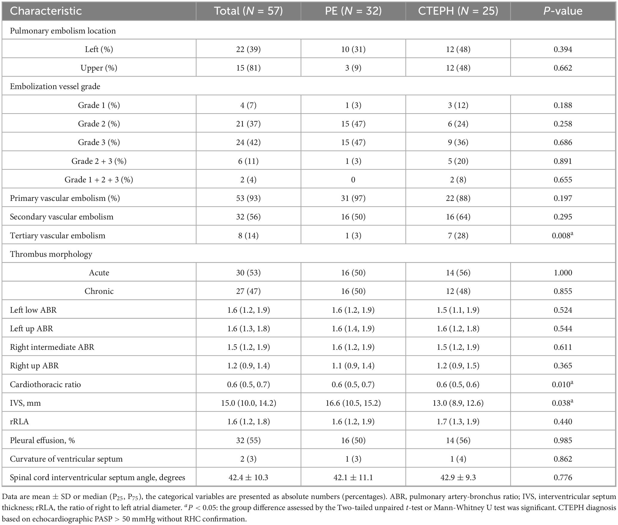 CT angiography is increasingly recognized as a valuable diagnostic tool for CTEPH due to its ability to provide rapid, non-invasive visualization of the pulmonary vasculature and facilitate the evaluation of right heart load. Unlike echocardiography which primarily evaluates cardiac functional consequences, CTA directly delineates pulmonary arterial obstructions, thrombus morphology, and small-vessel pathology, thereby enhancing diagnostic accuracy. Accordingly, pulmonary CTA data were collected for all subjects to comprehensively assess the radiologic characteristics of CTEPH in high-altitude populations (Table 2 and Supplementary Table 2). The results showed that patients in CTEPH group were more likely to have enlarged left upper pulmonary bronchus diameter (P = 0.002), a reduced cardiothoracic ratio (P = 0.010), and a thinner interventricular septum (IVS) (P = 0.038). Additionally, we analyzed pleural effusion, ventricular septum curvature, and spinal cord interventricular septum angle in both the PE and CTEPH groups (Figure 1) (29). The results indicated no statistically significant differences in these parameters between the two groups. Importantly, pulmonary embolism in CTEPH patients were more likely to occur in tertiary pulmonary arteries (P = 0.008). This may be due to the smaller diameter of subsegmental arteries (diameter < 2 mm), making them more prone to complete thrombotic occlusion (30), or due to impaired right heart venous return propelling thrombi toward distal vessels (31).
