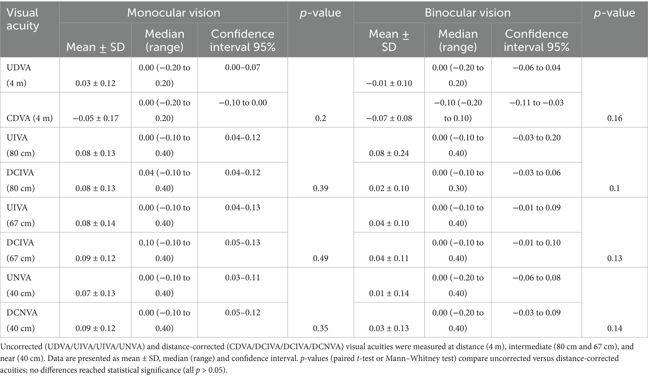 A key finding was that uncorrected and distance-corrected visual acuities did not differ significantly at any tested distance (all p > 0.05; Table 1), underscoring excellent spectacle independence. This “forgiving” performance aligns with prior reports that EDOF optics maintain ≥20/25 visual acuity despite up to ±1.00 D of spherical defocus, whereas multifocal designs degrade beyond ±0.50 D of defocus (23, 24). Consequently, in our cohort, only 2 eyes with a postoperative spherical equivalent exceeding ±0.50 D showed clinically meaningful improvements in visual acuity following spectacle correction.