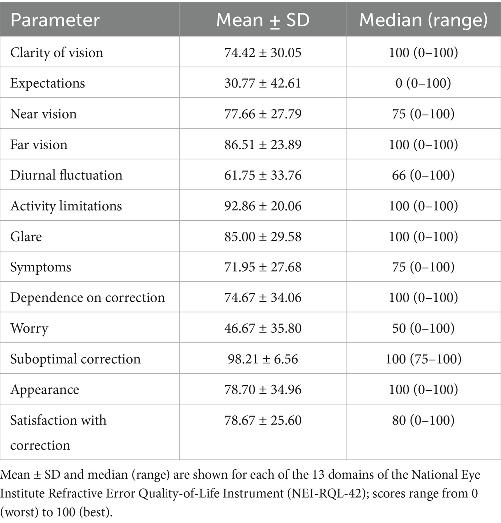 Postoperative quality of life outcomes evaluated with the NEI RQL-42 questionnaire were summarised in 13 domains (Table 2).