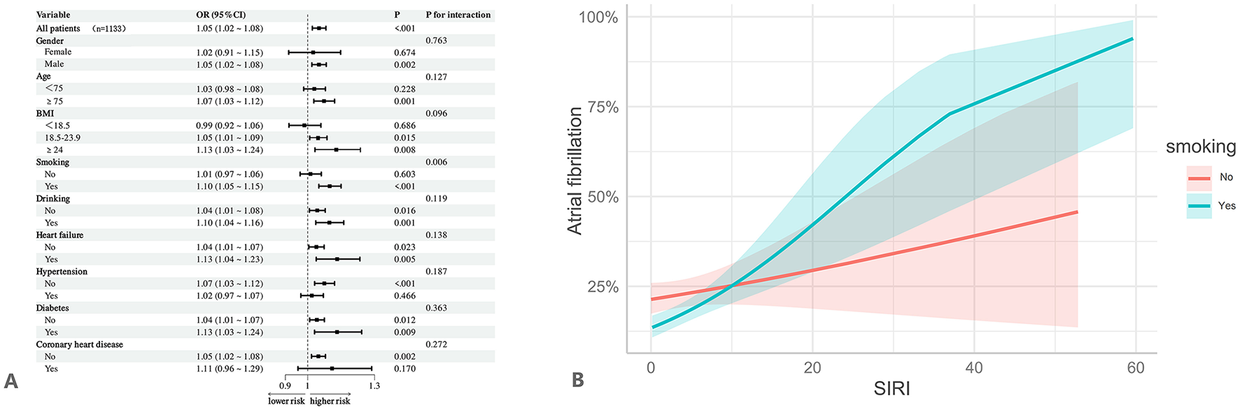 Elevated SIRI levels are independently associated with an increased risk of AF in patients with COPD, especially among smokers. As a simple and readily accessible biomarker of low-grade systemic inflammation, SIRI may serve as an effective tool for assessing the risk of atrial fibrillation in patients with COPD.