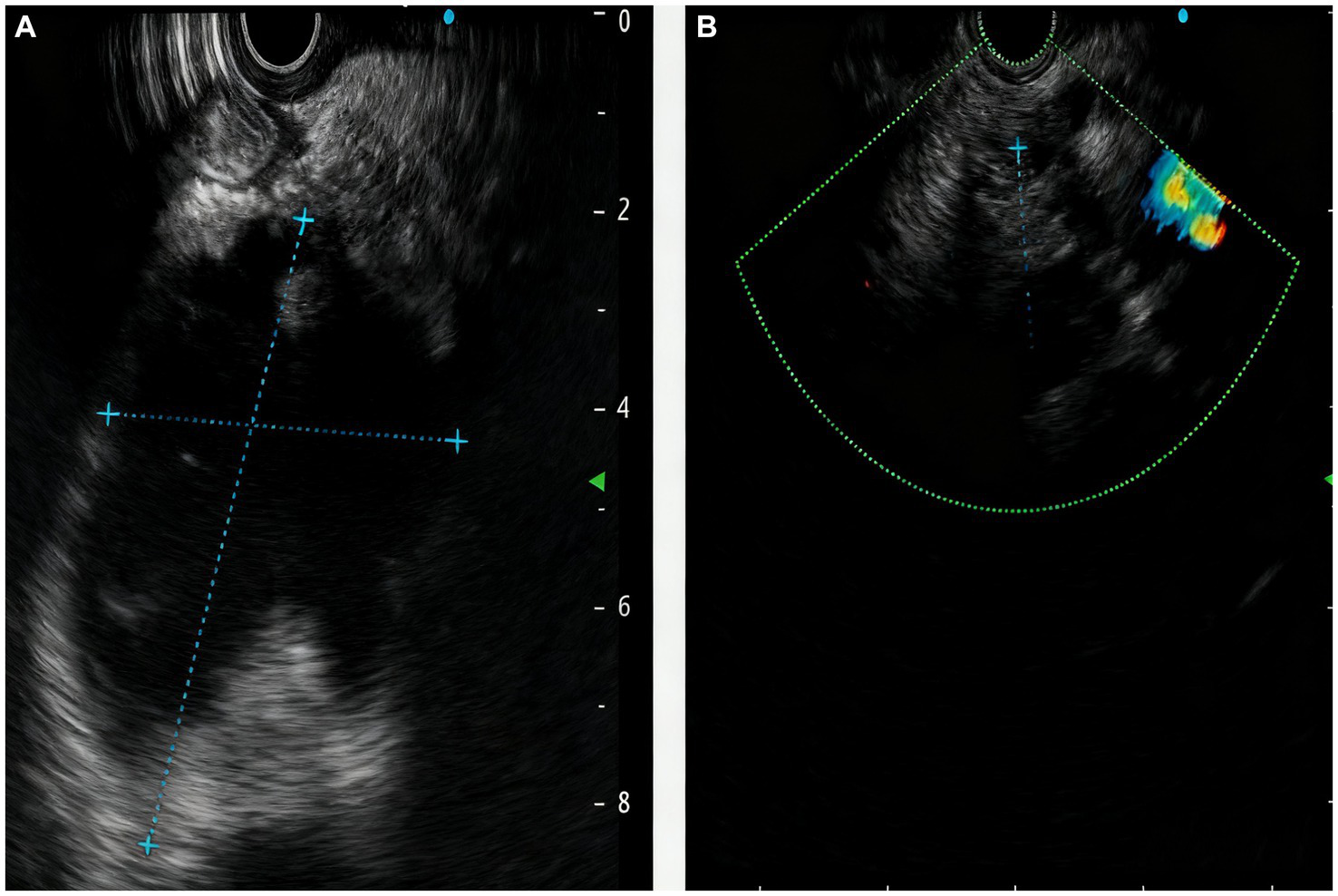 A PPC is typically diagnosed using ultrasound, CT scans, or magnetic resonance imaging (MRI). High-resolution endoscopic ultrasound (EUS) is particularly effective at detecting cystic lesions smaller than 2 cm in diameter, offering high diagnostic sensitivity. In addition, ERCP is a crucial tool not only for diagnosing pseudocysts but also for facilitating endoscopic treatment (9). The management of all PPCs is influenced by their size and morphology. Expert consensus guidelines have been established for managing pancreatic cysts, identifying specific morphologic features to classify cysts into two categories: those with “worrisome features” and those without. Worrisome features include: (1) cyst size large than 3 cm, (2) thickened or enhancing cyst walls, (3) non-enhancing mural nodules, and (4) main pancreatic duct caliber >5–9 mm (10). Careful imaging evaluation of incidental pancreatic cysts is essential, as the cyst’s characteristics play a critical role in determining management strategies. For instance, surveillance is generally advised for cysts smaller than 3 cm without worrisome features or high-risk indicators (11, 12). Conversely, cysts exhibiting worrisome features should undergo sampling via endoscopic ultrasound fine-needle aspiration (EUS-FNA) (13, 14), while those with high-risk stigmata are usually recommended for surgical resection.