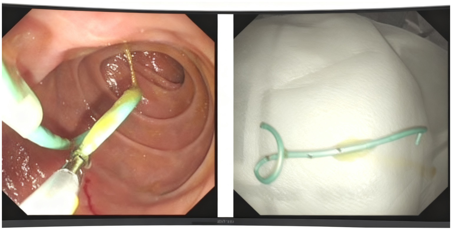 We utilized a duodenoscope to access the descending part of the duodenum, where we observed a single-hole type duodenal papilla. A three-chambered knife was employed to carry a guidewire and insert the tube, successfully entering the pancreatic duct. We maintained the guidewire in the pancreatic duct while injecting contrast agent through the three-chambered knife. This allowed us to visualize the main pancreatic duct, which measured approximately 1 cm in diameter. After the contrast injection, we aspirated the contrast agent from the pancreatic duct and placed a 5 Fr × 5 cm plastic pancreatic duct stent (Boston Scientific Jagwire™ SPSOF-5-5) in the duct. Upon stent insertion, a significant amount of white flocculent material was noted to flow out. The bile duct was not visualized during the procedure (Figure 3). Additionally, we inserted a nasojejunal nutrition tube. The patient’s vital signs remained stable upon completion of the procedure. This dual approach facilitated effective cyst decompression while simultaneously attenuating pancreatic auto-digestion by reducing secretory stimulation.