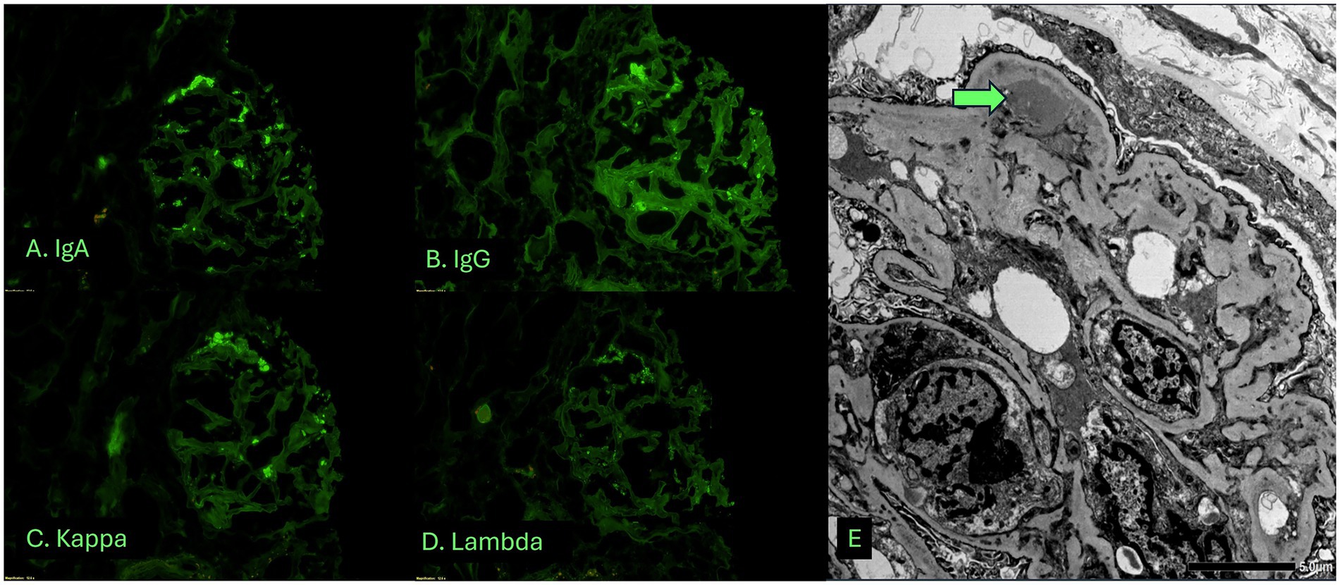 Figure 2. Immunofluorescence and electron microscopic studies showing polyclonal, capillary loop and mesangial deposits. (A–D) Immunofluorescence studies highlighting a glomerulus stained with IgA (A), IgG (B), kappa light chain (C) and lambda light chain (D). (E) Electron microscopy confirms the membranoproliferative pattern with double contours, hypercellularity, and shows subendothelial deposits (arrow).
