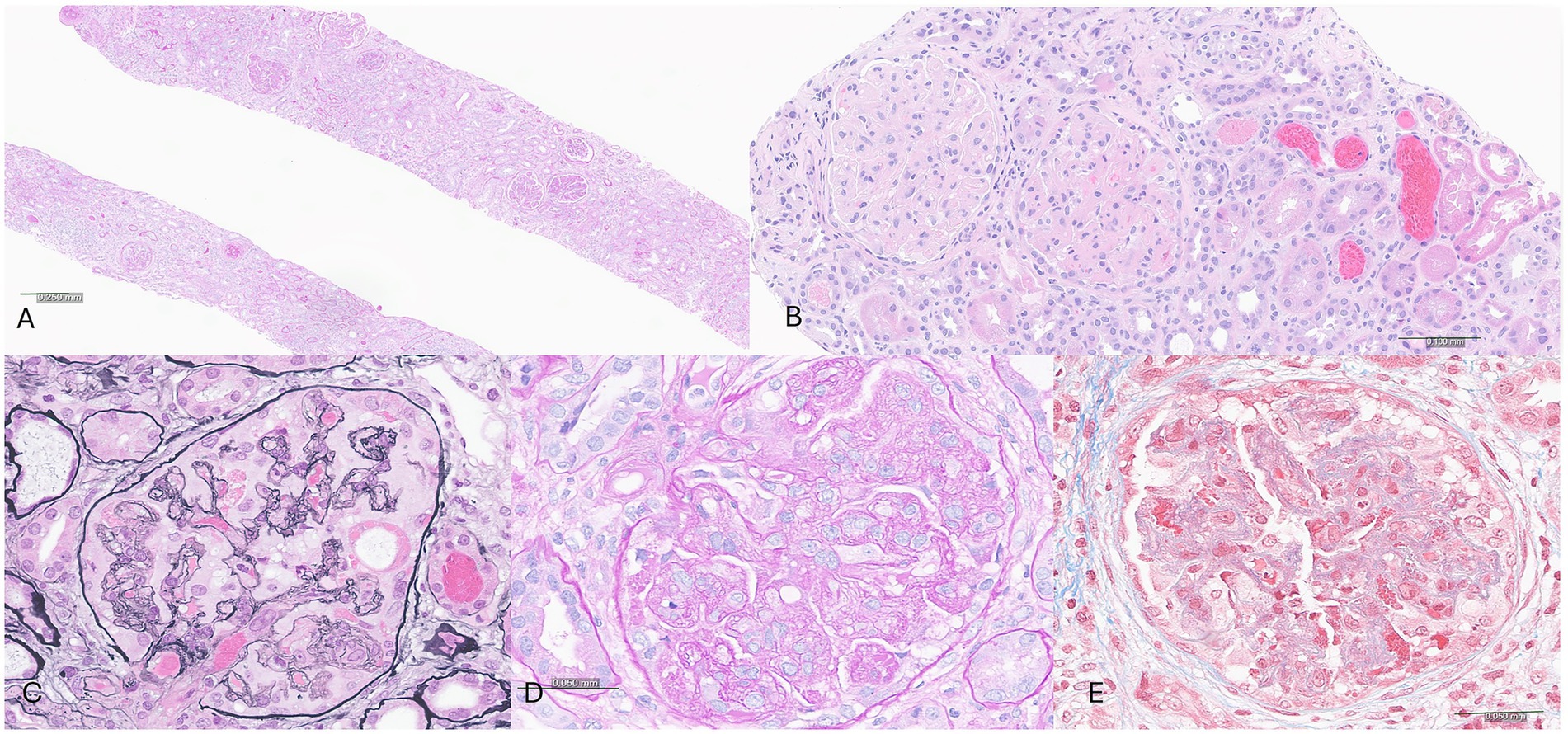 Figure 1. Light microscopic examination of the biopsy shows a membranoproliferative pattern glomerulonephritis associated with tubulointerstitial fibrosis and atrophy. (A) Low magnification view of biopsy cores stained with Hematoxylin and eosin stain. (B–E) High magnification view of glomeruli showing membranoproliferative pattern glomerulonephritis. (B) H&E stain showing two glomeruli with accentuated lobularization. Note RBC casts in tubules. (C) Jones methenamine silver stain. (D) Periodic acid Schiff stain. (E) Masson’s trichrome stain.