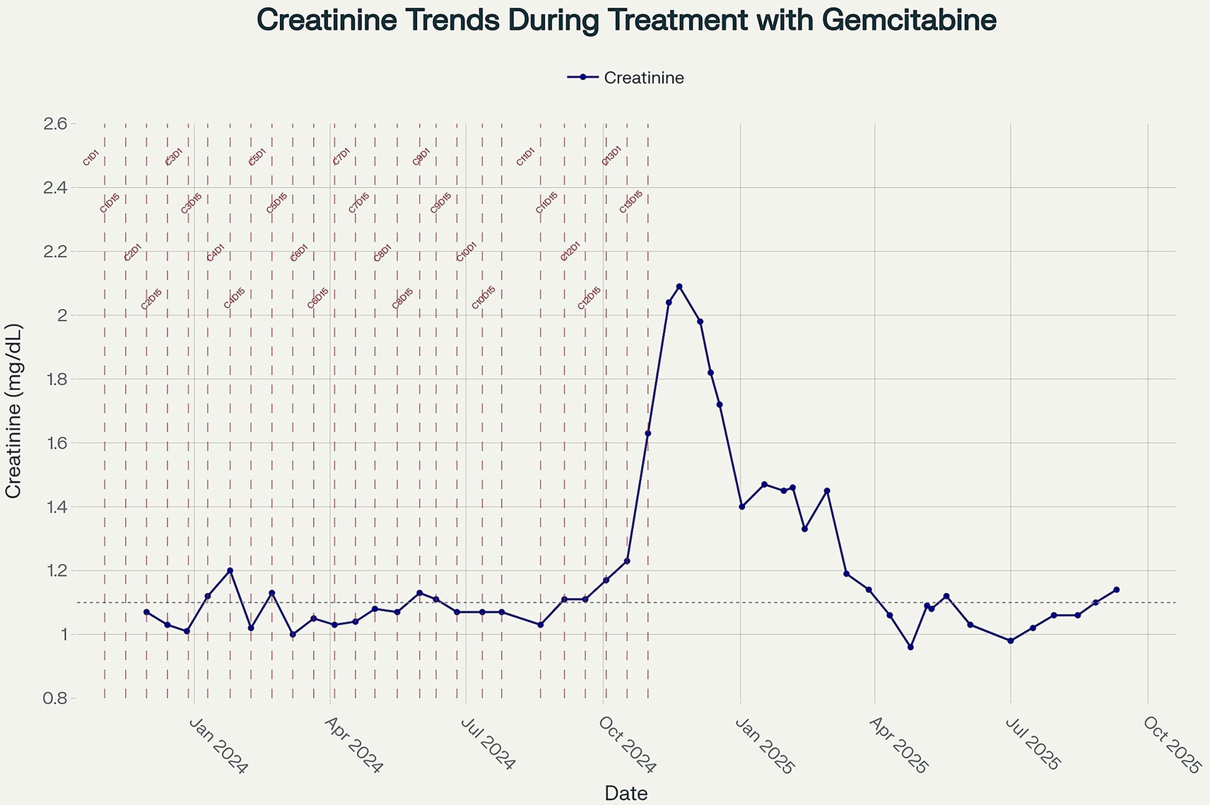 Figure 3. Line plot showing longitudinal serum creatinine measurements (mg/dL) from November 2023 to September 2025. Vertical dashed lines indicate the timing of gemcitabine administration cycles, with cycle numbers annotated. The dotted horizontal line represents the upper limit of normal for creatinine (1.04 mg/dL). Creatinine values remained within or near the normal range during the early treatment period and subsequently showed a progressive rise after cycle 13, peaking in November 2024, before partially improving upon treatment discontinuation.