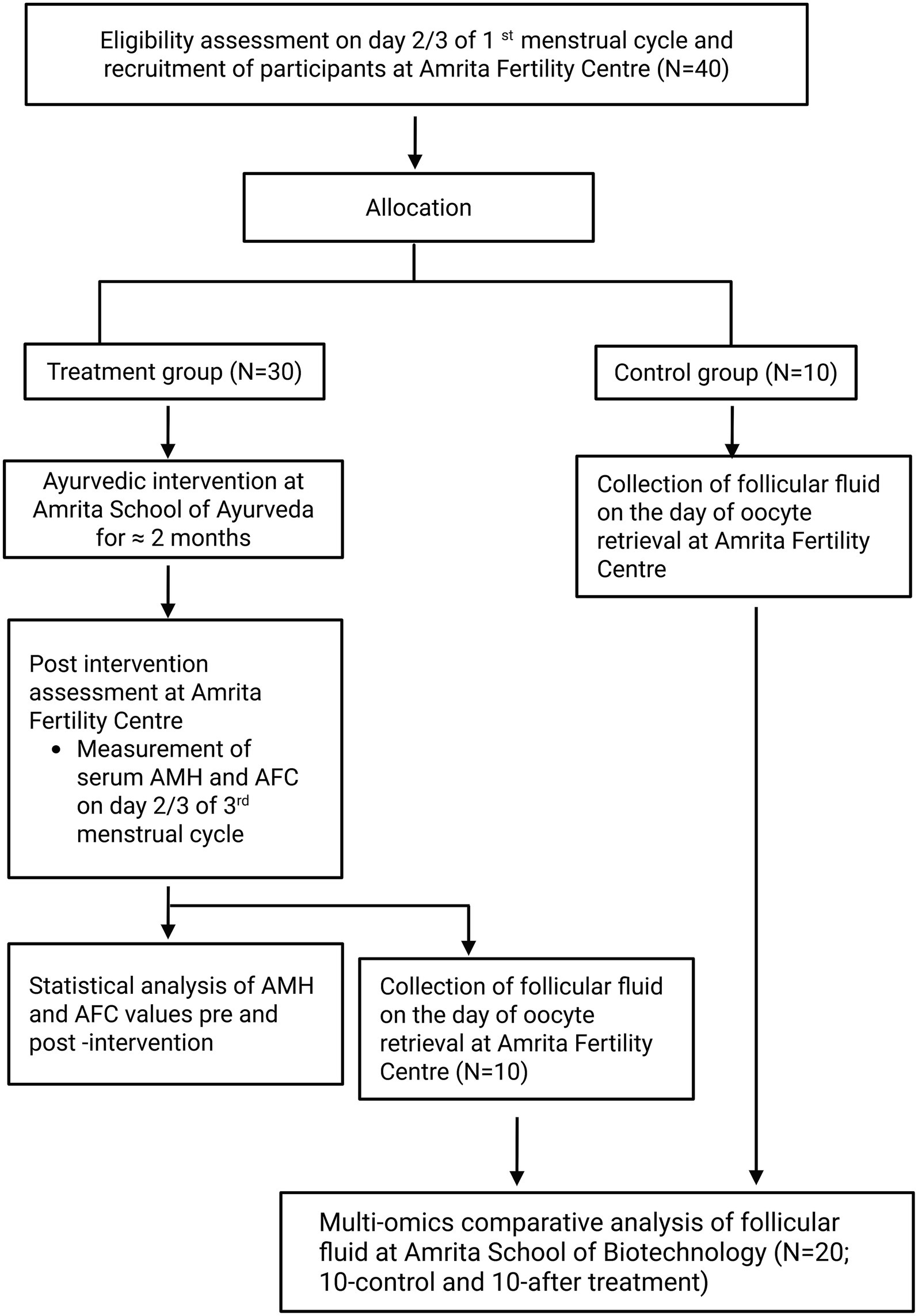 The participants will be screened for eligibility at Amrita fertility centre, Kochi. After baseline assessment of AMH and AFC on day 2/3 of the menstrual cycle, 30 participants who are satisfying the eligibility criteria will be recruited for the study and will be admitted for Ayurveda treatment at Amrita School of Ayurveda, Kollam for a maximum of 21 days. On discharge, participants will be dispensed with internal medicines for 1 month. Post assessment will be done at Amrita Fertility Centre on day 2/3 of their next menstrual cycle which comes after completing 1 month of internal medications. Follicular fluid will be collected on the oocyte retrieval day of their next IVF cycle for multi-omics analysis (Treatment group—10 and Control group—10). The participant timeline is detailed in Table 1. The sample collected will be then transferred to Amrita School of Biotechnology for multi omics analysis.