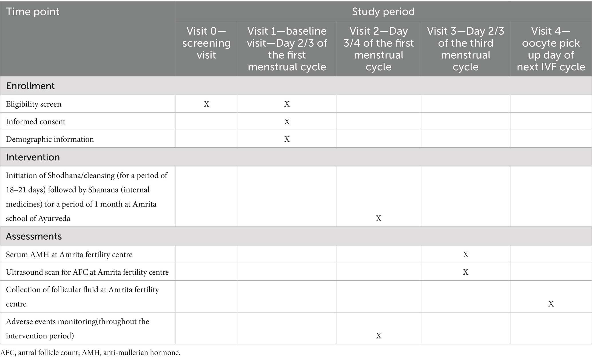 This is a prospective, exploratory, single-arm, open-label, single-centred study, coordinated by Amrita Fertility Centre, Amrita School of Ayurveda, and Amrita School of Biotechnology, India with two assessment points (baseline and post-intervention). Participants are women diagnosed with DOR undergoing fertility treatments. Women under the age of 40 satisfying all the eligibility criteria and willing to provide informed consent will be recruited from Amrita Fertility Centre, Kochi. Recruited participants will be admitted at Amrita School of Ayurveda, Kollam to undergo a standardized Ayurvedic treatment protocol for a maximum period of 21 days. Following the inpatient treatment, participants will be advised to continue prescribed internal medications for an additional 1 month. After undergoing Ayurveda treatment, participants will be sent back to Amrita Fertility Centre for post-assessment and further fertility treatments, during which follicular fluid will be collected for multi-omics analysis. Figure 1 depicts the trial’s participant flow. The Standard Protocol Items: Recommendations for Intervention Trials (SPIRIT) declaration is followed while reporting the protocol (22). The institutional ethical committee approved the study and is prospectively registered under ctri.nic.in with the number CTRI/2023/11/059872 on November 15, 2023.