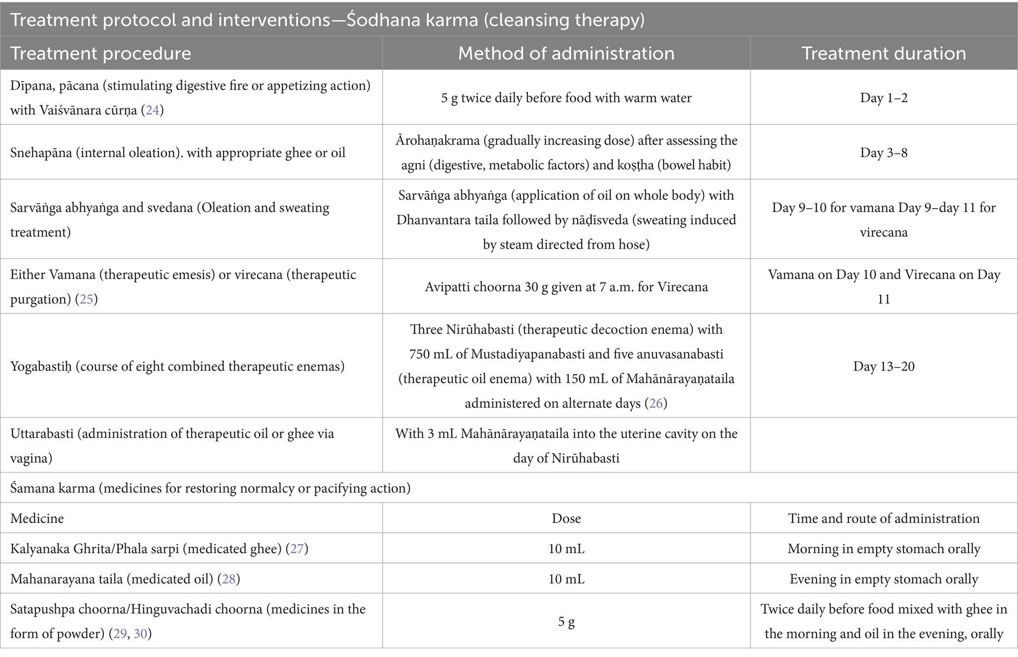 Śodhana karma (cleansing therapy): the participant will be admitted for a maximum of 21 days following the cessation of menstrual bleeding in the first menstrual cycle. The trial intervention begins with dīpana (stimulating digestive fire or appetizing action) and pācana (digestive action) by administering Vaiśvānara Cūrṇa for 2 days. This is intended to enhance the digestive capacity of the participant and prepare them for the subsequent procedure, snehapāna (internal oleation). Snehapāna (internal oleation) is done by the oral administration of medicated ghee or oil in gradually increasing doses until signs of adequate oleation or samyak snigdha lakṣaṇas are observed or for up to a maximum duration of 7 days. The selection of medicine, dose and duration of snehapāna (internal oleation) will be decided based on the agniḥ (digestive, metabolic factors), koṣṭhaḥ (bowel habit) and clinical condition of the participant. Adequate oleation ensures that the body is properly lubricated for detoxification. Snehapāna (internal oleation) is followed by svedana (sudation therapy) which will be performed for 2–3 days which further facilitates the śodhana karma (cleansing therapy). These preparatory procedures together constitute the pūrvakarma (preparatory phase) of śodhana karma (cleansing therapy).