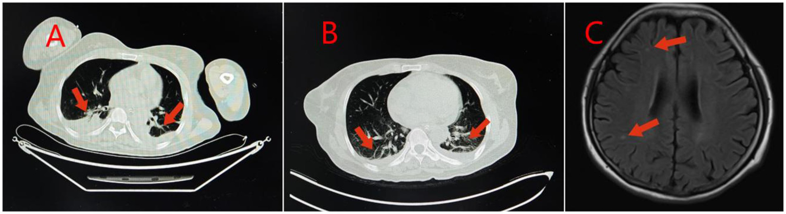 Imaging findings in Case 2: Panel (A) Lung CT shows inflammation or hypostatic changes in both lungs, and a small amount of pleural effusion in both pleural cavities; Panel (B) Reexamination of lung CT shows inflammation, fibrous foci, and hypostatic changes in both lungs, and a small amount of pleural effusion in both pleural cavities; Panel (C) Brain MRI shows a small amount of ischemic degenerative foci in the white matter of both cerebral hemispheres.