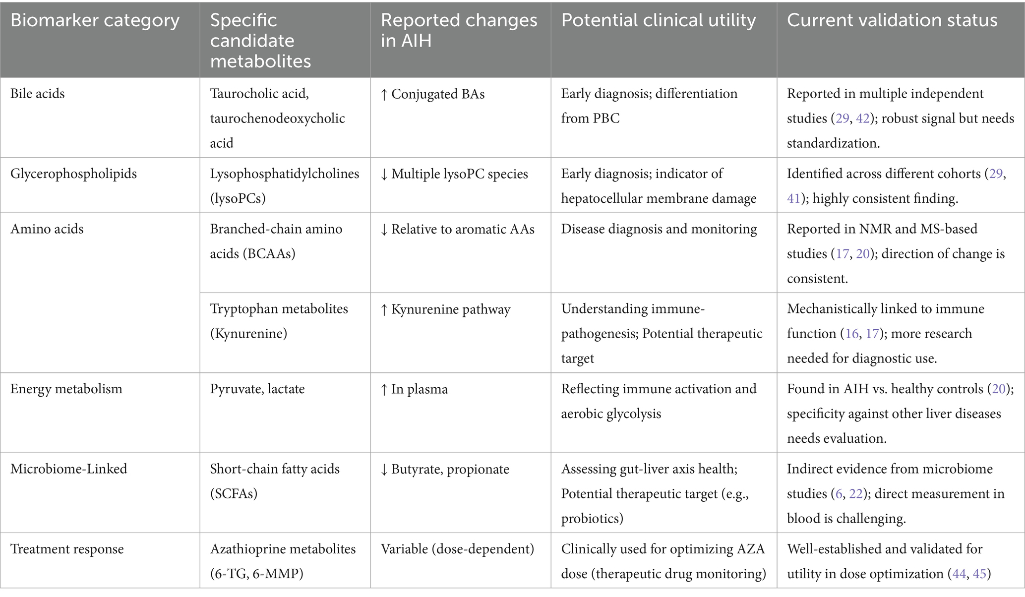 The application of metabolomics in the diagnosis of AIH is constrained by several persistent limitations. Metabolomic data are profoundly influenced by pre-analytical and analytical conditions, including instrument parameters and sample processing procedures, resulting in substantial inter-laboratory variability. The imperative for stringent control over sample collection timing and storage conditions to preserve metabolite stability further restricts the reproducibility and accuracy of findings in clinical settings. Moreover, the current technological landscape lacks the capacity for the comprehensive detection of all metabolites. Compounding these issues is the limited specificity of candidate AIH biomarkers, which are frequently confounded by other hepatic disorders such as PBC and DILI, in addition to medications and other variables. These challenges collectively impede the development of a biomarker or a simple model capable of concurrently achieving high sensitivity and specificity.