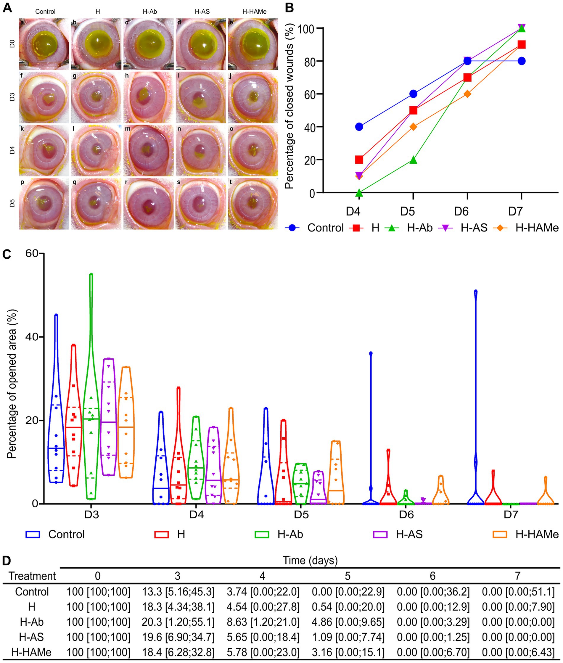 Figure 2. (A) Progression of epithelial defects in rabbit eyes treated with artificial tears (Control) or hydrogel variants (H, H-Ab, H-AS, H-HAMe) from day 3 (D3) to day 5 (D5), assessed via fluorescein staining. (B) The percentage of wounds closed per day from day 4 (D4) to day 7 (D7). (C) Percentage of the surgical wound area remaining open from day 3 (D3) to day 7 (D7), with median (solid line) and interquartile range (dashed line) shown in violin plots. (D) Re-epithelialization progress in rabbit eyes treated with hydrogel variants (H, H-Ab, H-AS or H-HAMe) or control, shown as median wound area (%) and minimum and maximum values [min; max]. No significant differences were observed between treatments and samples over time.