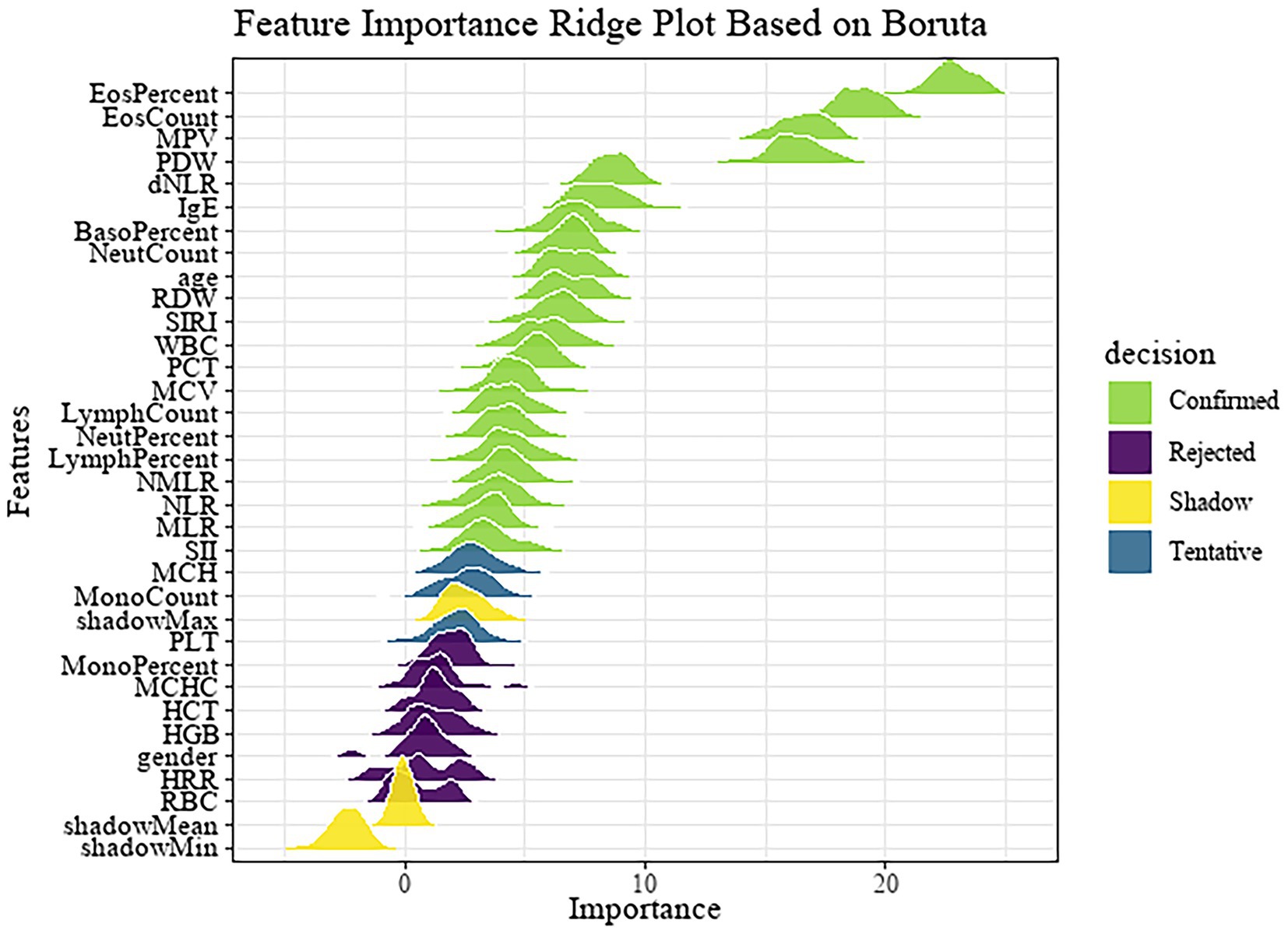 Subsequently, the dataset was randomly divided into a training set (n = 607) and a test set (n = 407) with a 6:4 ratio, where 60% of the data were used for model development and 40% for internal validation. Feature selection was performed exclusively on the training set to avoid data leakage. The Boruta algorithm, a wrapper method based on random forest classification, was applied to the training set to identify important features. The results are illustrated in Figure 2.