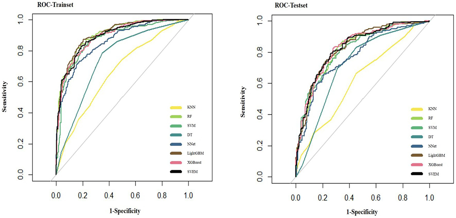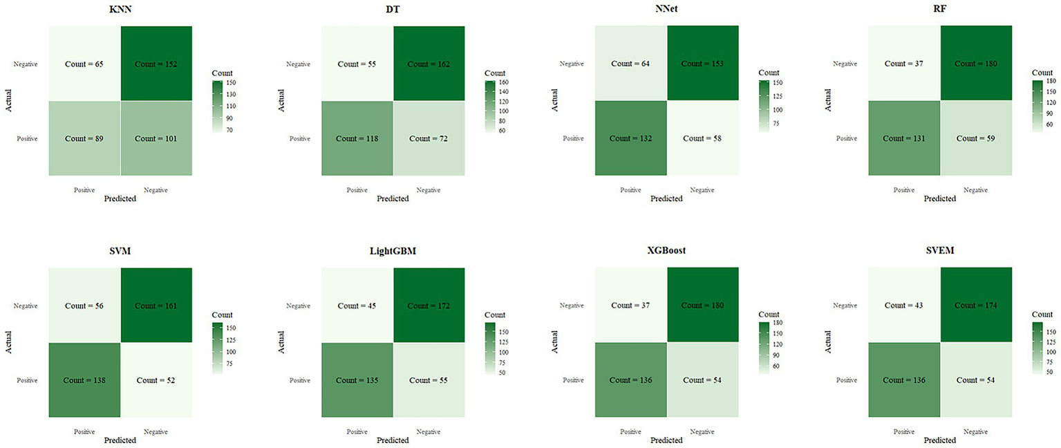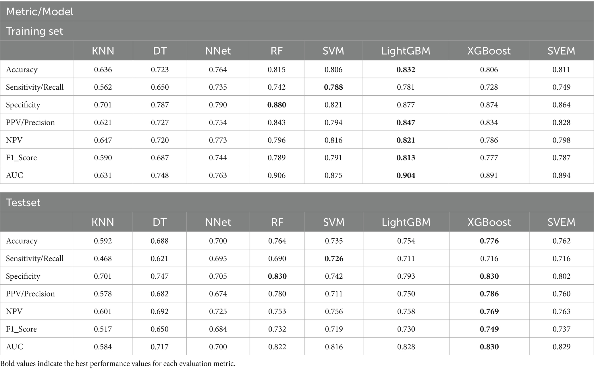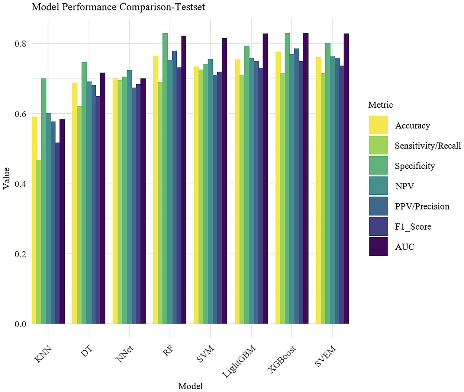2. Model development and optimization: Eight machine learning models were developed, including k-Nearest Neighbors (KNN), Decision Tree (DT), Neural Network (NNet), Random Forest (RF), Support Vector Machine (SVM), Light Gradient Boosting Machine (LightGBM), and Extreme Gradient Boosting (XGBoost). Multiple rounds of parameter tuning were conducted, and a soft-voting ensemble model (SVEM) was created by integrating the top five models. Among them, the XGBoost model exhibited the best overall performance.