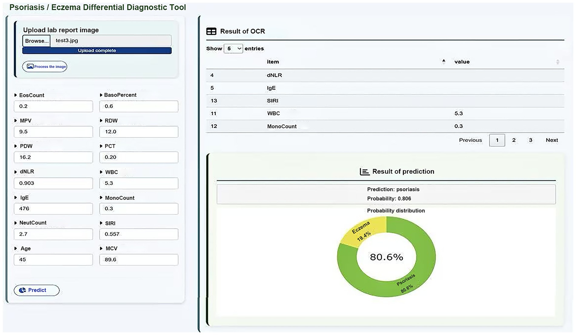 The final prediction model is intended to be implemented as an online web application. When users input the relevant features, the system will generate a prediction indicating whether the patient is more likely to have psoriasis or eczema, along with the corresponding probability score. To enhance usability and reduce the time burden on clinicians, an OCR function has been integrated, allowing users to either enter data manually or upload laboratory reports for automated extraction of relevant information.