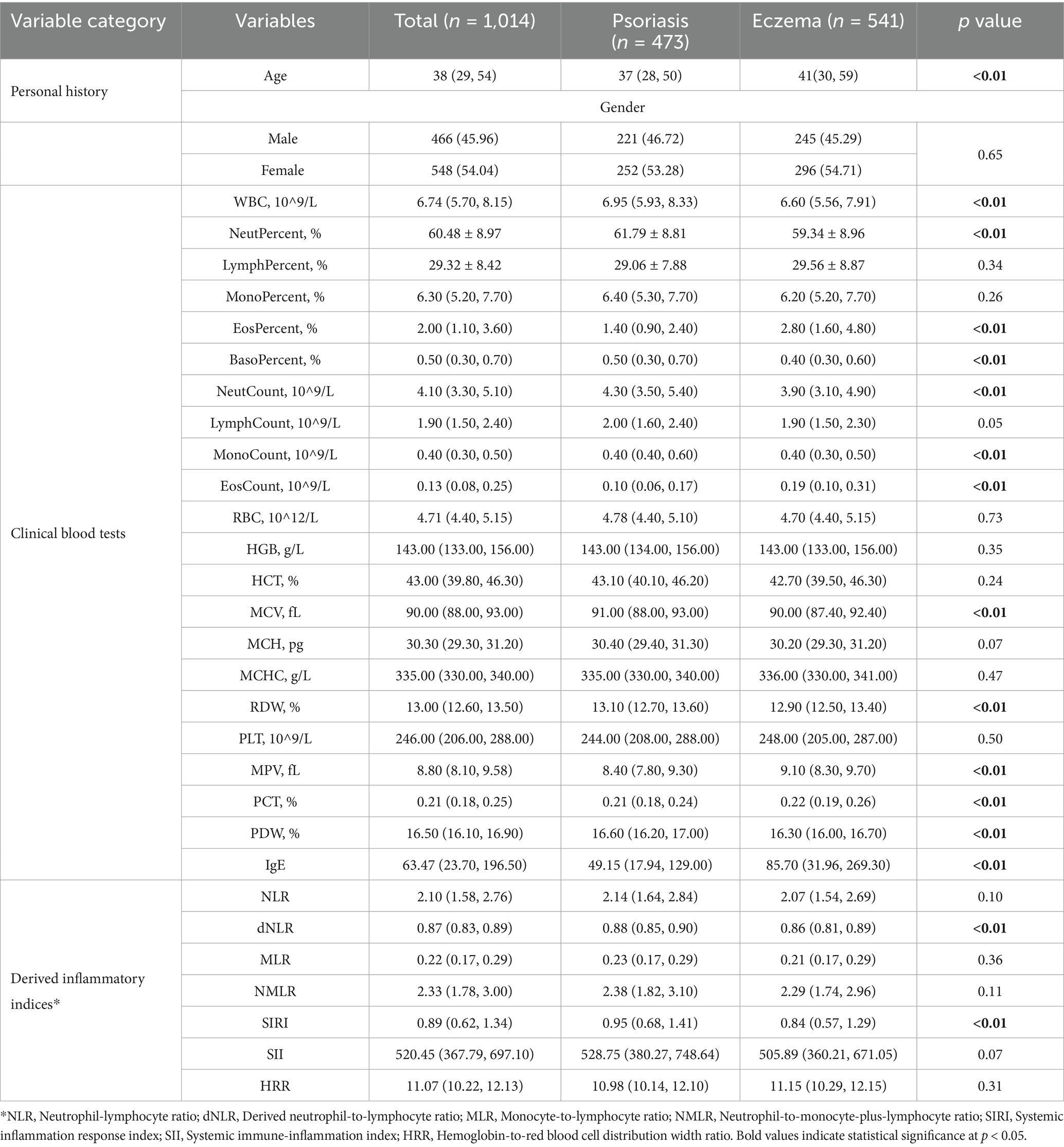 A total of 1,014 patients from Shengjing Hospital were included for initial analysis using the full dataset. The normality of continuous variables was evaluated with the Shapiro–Wilk test. Normally distributed variables were compared by independent samples t-tests and expressed as mean ± standard deviation (Mean ± SD). For variables not normally distributed, the Mann–Whitney U test was applied, and results were reported as median and interquartile range (Medians and IQRs). Categorical data were analyzed using the chi-square test. The baseline characteristics are shown in Table 1, indicating that 16 out of 31 variables significantly differed between patients with psoriasis and those with eczema.