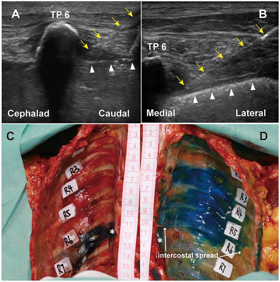Figure 1. Ultrasound views of T6-7 paravertebral injections using two approaches and dye spread in PVS after injections. (A) showed a transverse cross-sectional image at transverse process, a typical ultrasound image during TPVB using TI approach. (B) showed a sagittal cross-sectional image at the thoracic PVS, a typical ultrasound image during TPVB using SI approach. (C) PVS of T6-7 segment was stained using SI approach. (D) PVS of T6-7 to T3-4 segments were stained using TI approach. Yellow arrowheads indicated injection needle. Upward white triangles indicated pleura. * indicated the injection site. TP, transverse process; PVS, paravertebral space; TPVB, thoracic paravertebral block; TI, transverse in-plane; SI, sagittal in-plane.