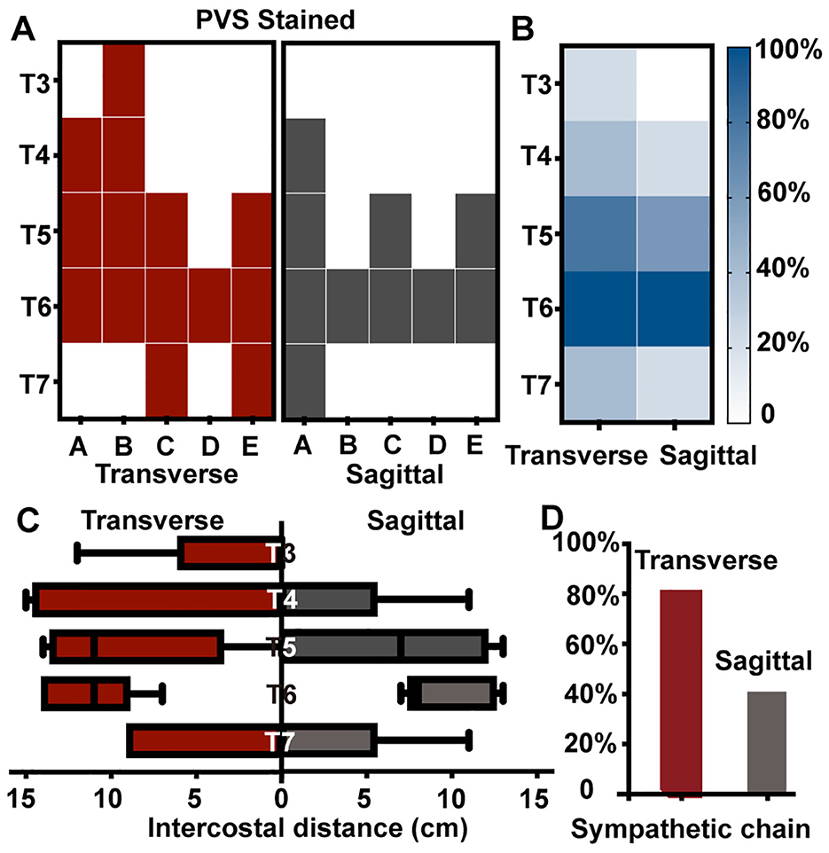 Figure 2. Contrast dye spread after ultrasound-guided paravertebral injections at T6-7. (A) showed the contrast dye distribution in PVS of 10 injections on 5 cadavers. A-E indicated the five cadavers. PVS stained after transverse TI approach were colored in red, while after SI approach were in black. (B) presented a heatmap summarizing the contrast dye distribution in all five cadavers. The intensity of the color corresponded to the probability of staining at each segment. Darker colors indicated a higher probability of staining. (C) showed the distance of each segment after ultrasound-guided paravertebral injections. Box plot showed the median, interquartile range, minimum and maximum values. (D) showed the percentage of sympathetic chain stained after paravertebral injections. Gray bars presented the results of SI approach, and red bars presented the results of TI approach. PVS, paravertebral space; TI, transverse in-plane; SI, sagittal in-plane.
