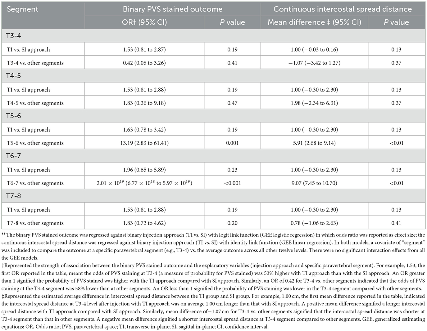 Table 1. Association between the odds of PVS stained/continuous intercostal spread distance and the injection approach, adjusting for vertebral segment using GEE models**.