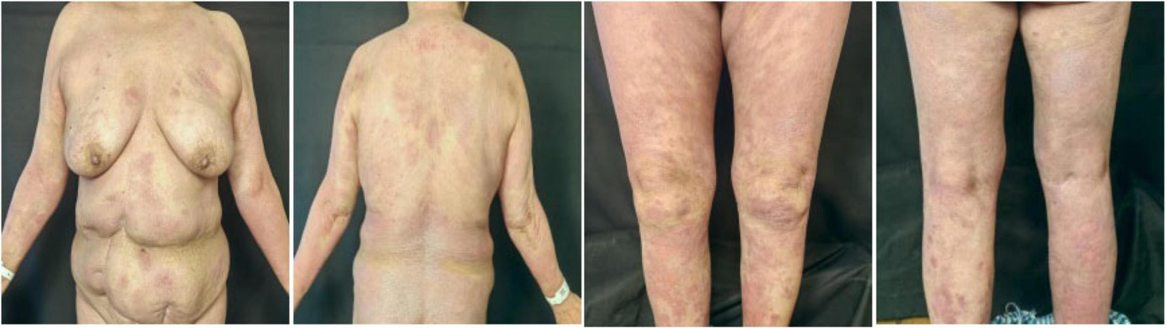 The patient is a 75-year-old female with a 10-year history of GPP. Over her disease course, she sequentially received multiple systemic therapies (Table 1): cyclosporine (3 mg/kg/day for 8 months), a calcineurin inhibitor targeting T-cell activation; compound glycyrrhizin (150 mg/day for 6 months), an anti-inflammatory agent containing glycyrrhizic acid that has immunoregulatory, antiallergic, and hepatoprotective functions, commonly used in Asian GPP patients with hepatic comorbidities (4); tripterygium glycosides (60 mg/day for 3 months), an immunosuppressive botanical extract that suppresses NF-κB and the IL-23/Th17 axis (5); and acitretin (30 mg/day for 4 months), a retinoid that alleviates the condition by regulating cell differentiation and proliferation, exerting anti-inflammatory effects, inhibiting keratin formation, and suppressing neutrophil chemotaxis (6). Despite transient therapeutic responses, all regimens required discontinuation due to disease relapse or adverse events—most notably acitretin-induced cheilitis and palmoplantar desquamation. Compound glycyrrhizin use was based on studies conducted among the Asian population (4), while tripterygium glycosides efficacy data derived from Chinese cohorts (5). Due to poorly controlled skin lesions, significant pain, and recurrent fever, she received a 900 mg intravenous infusion of spesolimab in August 2023 and induced remission for 6 months. Within 48 h post-infusion, her body temperature decreased from 39.2 °C to 36.5 °C, and pustules showed significant resolution within 7 days. In February 2024, the patient experienced a disease relapse and sought treatment at a local traditional Chinese medicine clinic. She received an unspecified traditional Chinese medicine regimen that yielded no significant clinical improvement.