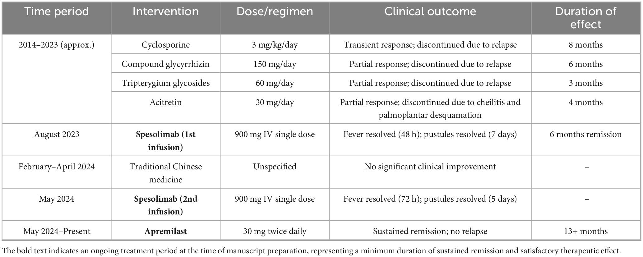 This case demonstrated a robust initial response to spesolimab induction therapy, achieving marked reduction in pustular eruptions and systemic symptoms. However, relapse occurred several months later. Given inadequate response to conventional therapies (cyclosporine, tripterygium glycosides, compound glycyrrhizin, acitretin) and significant adverse effects during acitretin treatment, we implemented a sequential biologic strategy: spesolimab for acute flare control with transition to apremilast for maintenance therapy. This approach exploits complementary mechanisms—spesolimab targets the acute IL-36-driven inflammatory cascade, while apremilast modulates the chronic Th17-mediated inflammatory milieu. Subsequent apremilast initiation proved essential for sustaining remission and preventing relapse. The combination demonstrated a favorable safety profile, with no treatment-emergent adverse events observed during the monitoring period. This tolerability is clinically significant given the requirement for long-term therapy in GPP.