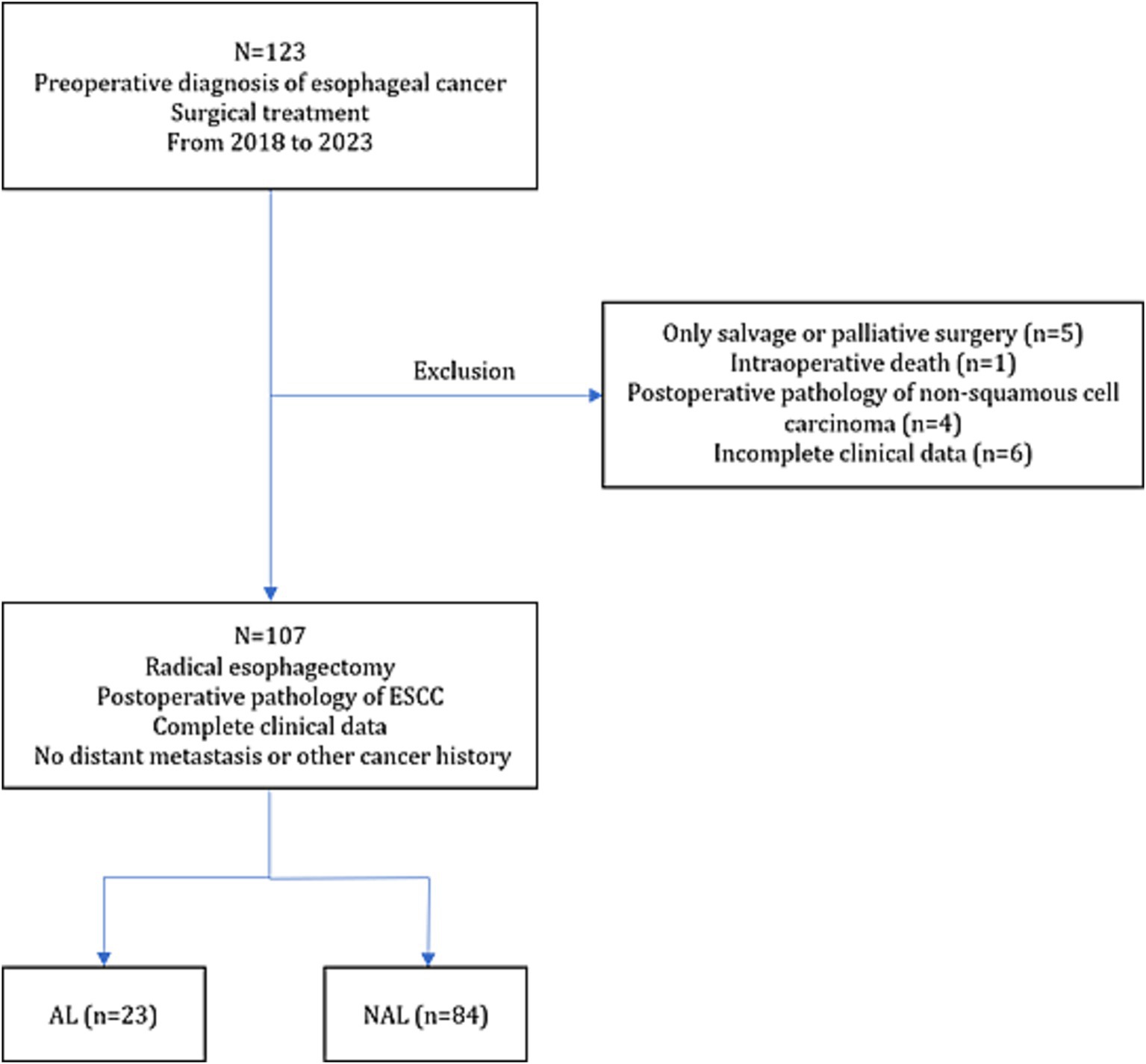 The inclusion criteria were as follows: 1. preoperative clinical diagnosis of esophageal cancer and completion of esophageal cancer surgery between 2018 and 2023; 2. complete clinical data without missing information; 3. Absence of distant metastases or other histories of malignancy. The exclusion criteria were as follows: 1. patients who did not undergo radical esophagectomy, or underwent salvage or palliative surgical procedures; 2. intraoperative death; 3. pathology indicating non-squamous cell carcinoma; 4. incomplete clinical data. Patients were divided into two groups based on the occurrence of AL postoperatively: AL and NAL groups.